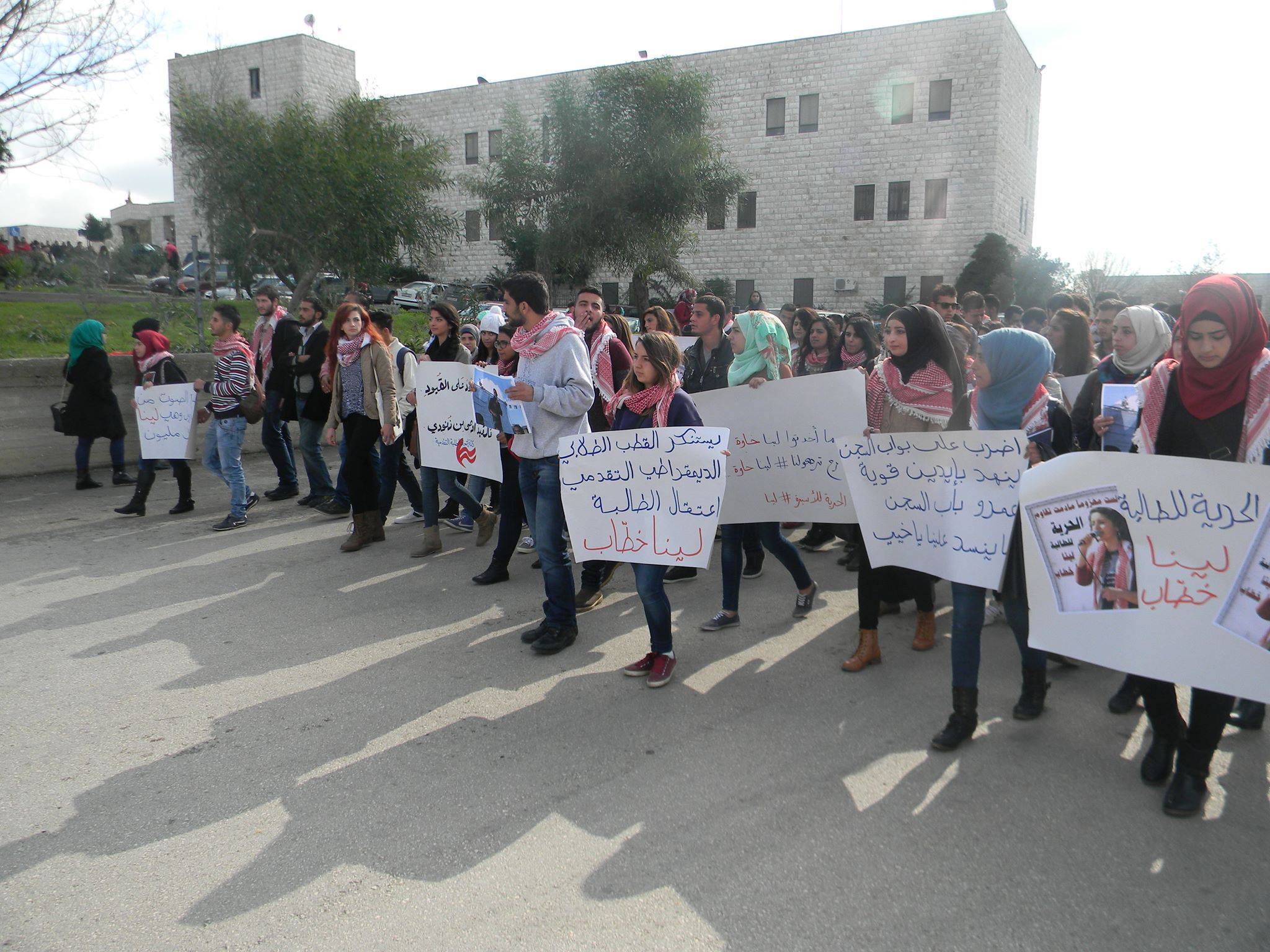 Students at Bir Zeit University protested and marched demanding Lina’s freedom, and the freedom of all Palestinian students held as political prisoners in Israeli occupation prisons, at a demonstration organized by the Progressive Democratic Student Pole on Monday, 15 December.