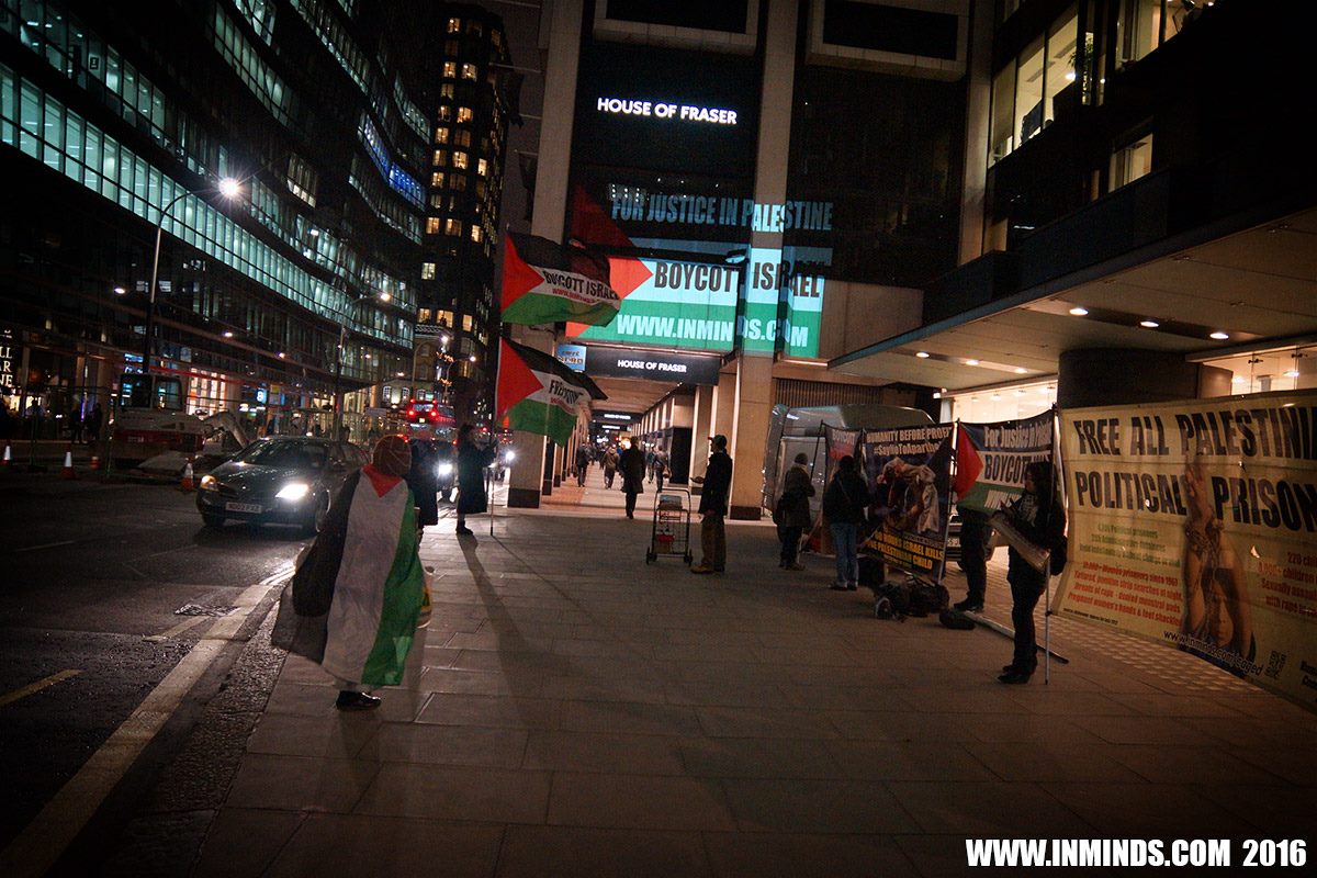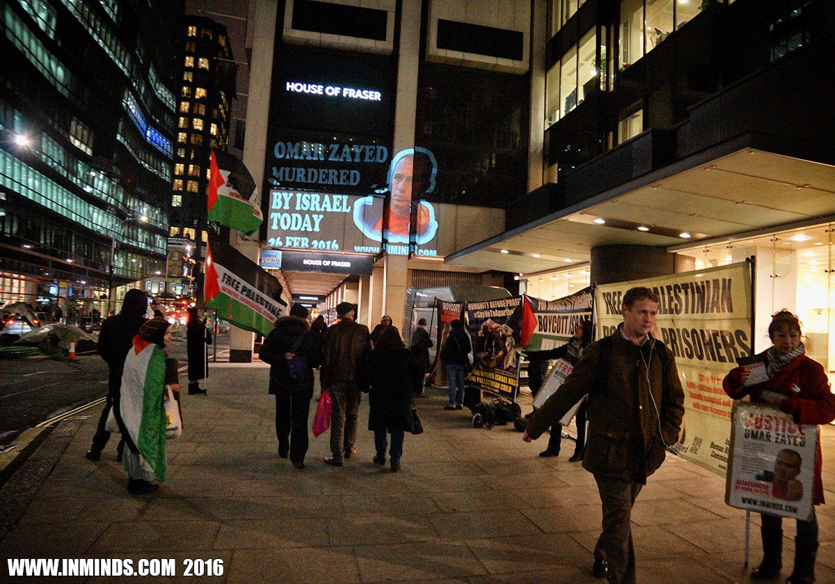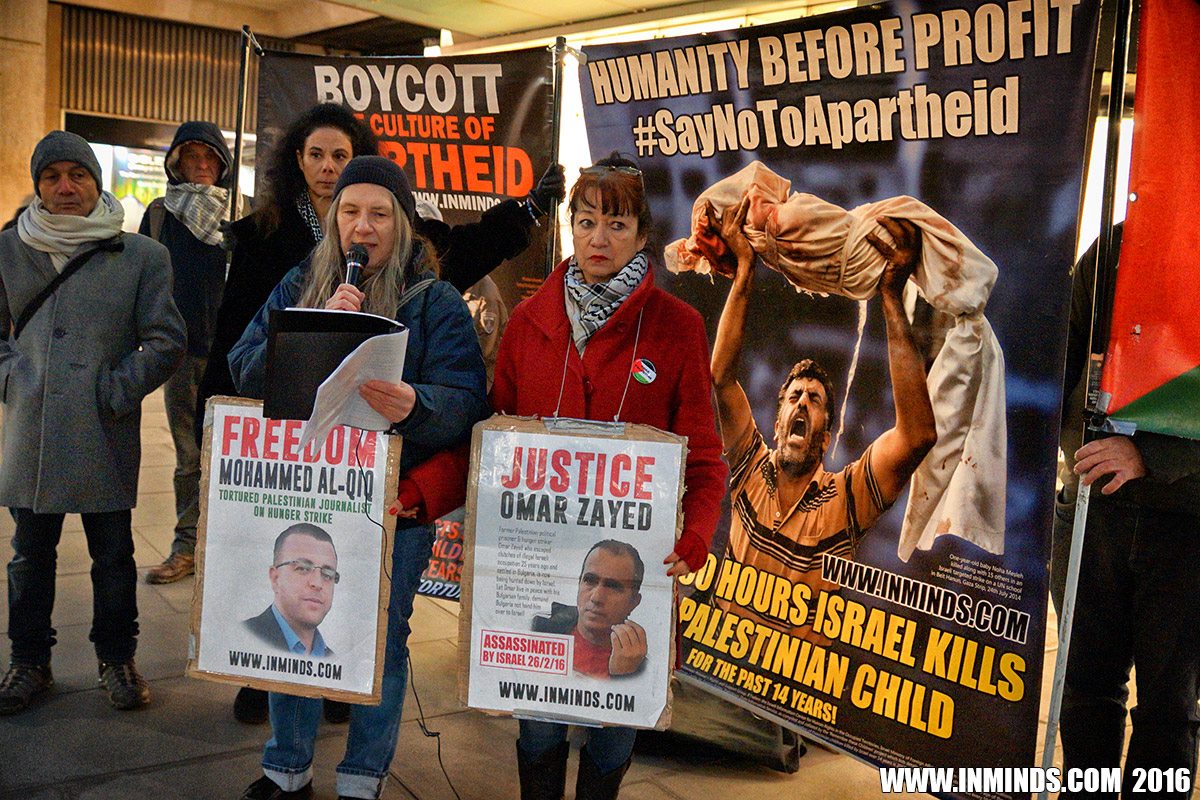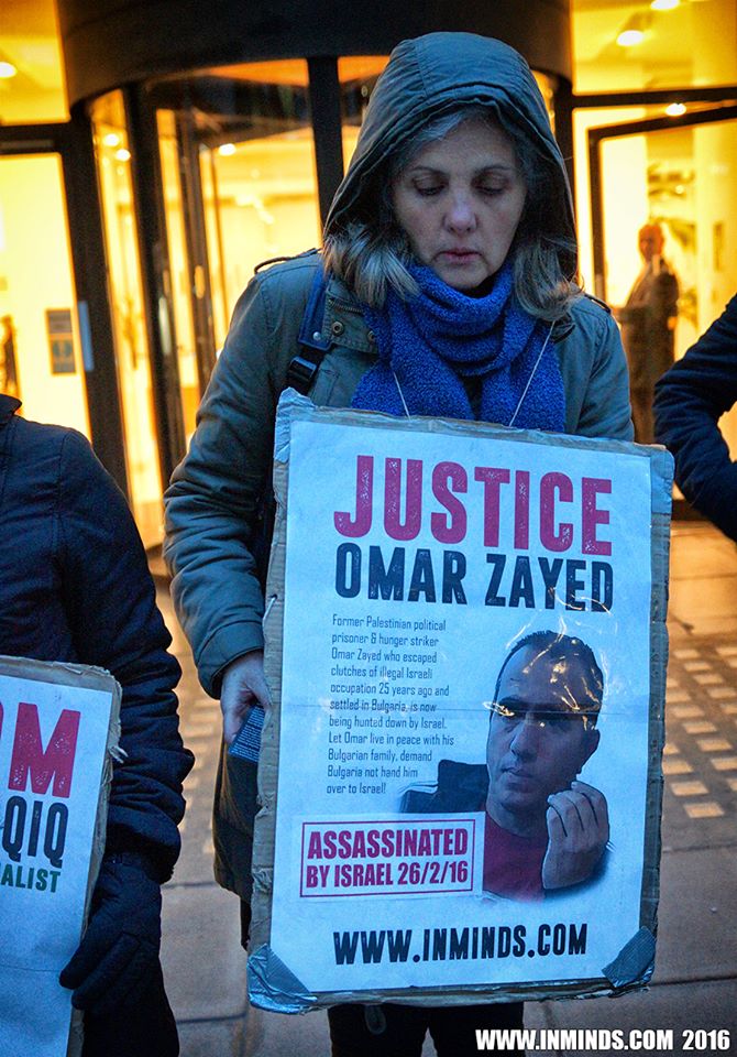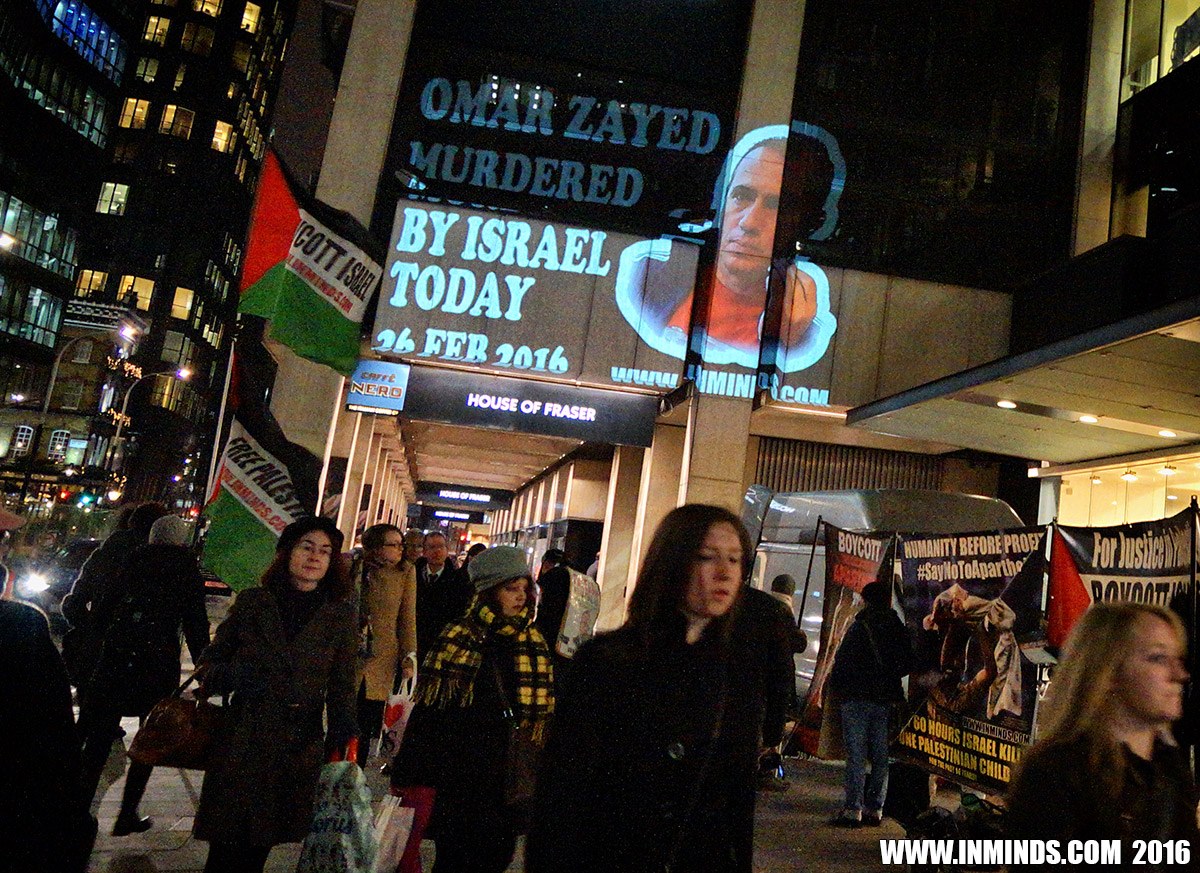 Inminds organized a protest in London outside the headquarters of security corporation G4S, part of its ongoing campaign to support Palestinian prisoners. The demonstration, held on Friday, 26 February, was organized in solidarity with imprisoned Palestinian journalist Mohammed al-Qeeq, 33, who won his freedom following 94 days of hunger strike, ending his strike on Friday. In addition, protesters called for justice and accountability for Omar Nayef Zayed, former Palestinian prisoner killed in the Palestinian embassy in Sofia, Bulgaria. Protesters projected large images of Nayef Zayed, and calls for boycott of G4S and Israel, on the external wall of the G4S building.