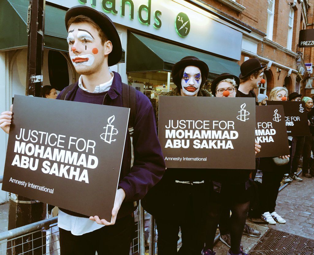 Events and actions in London, New York, Brussels, Heidelberg, Madrid, Switzerland, Toulose and more have demanded Abu Sakha’s release, often including theatrical elements of performance and circus. Amnesty International’s campaign has included outdoor protests as well as online actions that have been supported by tens of thousands. Upcoming events focused on Abu Sakha are planned in Brussels, London and elsewhere.