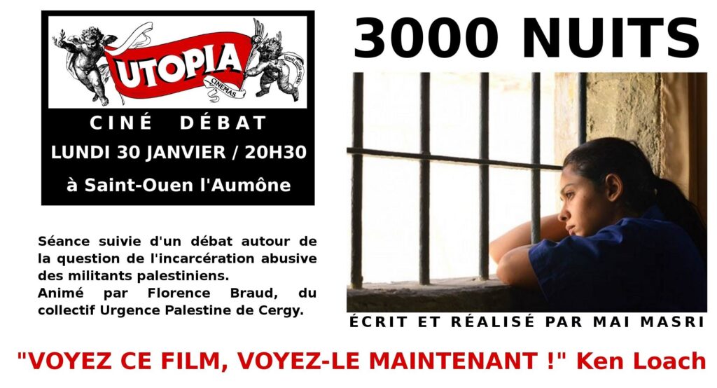 This session on Monday, 30 January at Cinema Utopia Saint-Ouen will screen the film, “3000 Nights,” directed by Mai Masri. The screening will be followed by a discussion on Palestinian political prisoners, with Florence Braud, of the Collectif Urgence Palestine Cergy, who returned recently from Palestine, and Charles Beillard, president of Abna Philistine, the association of French-Palestinian families.