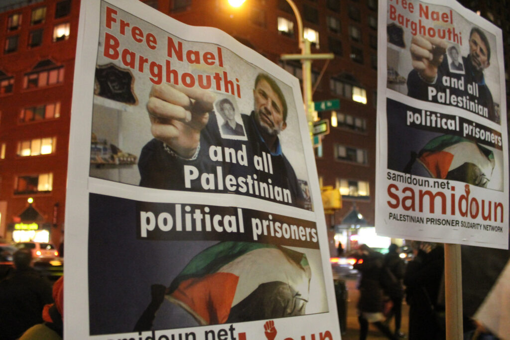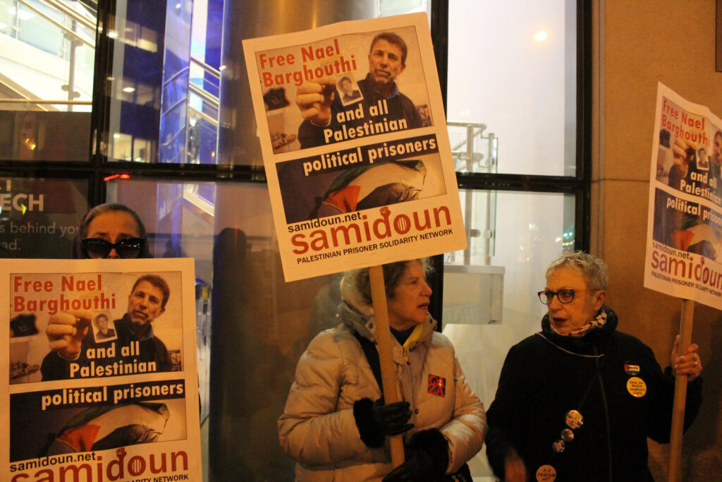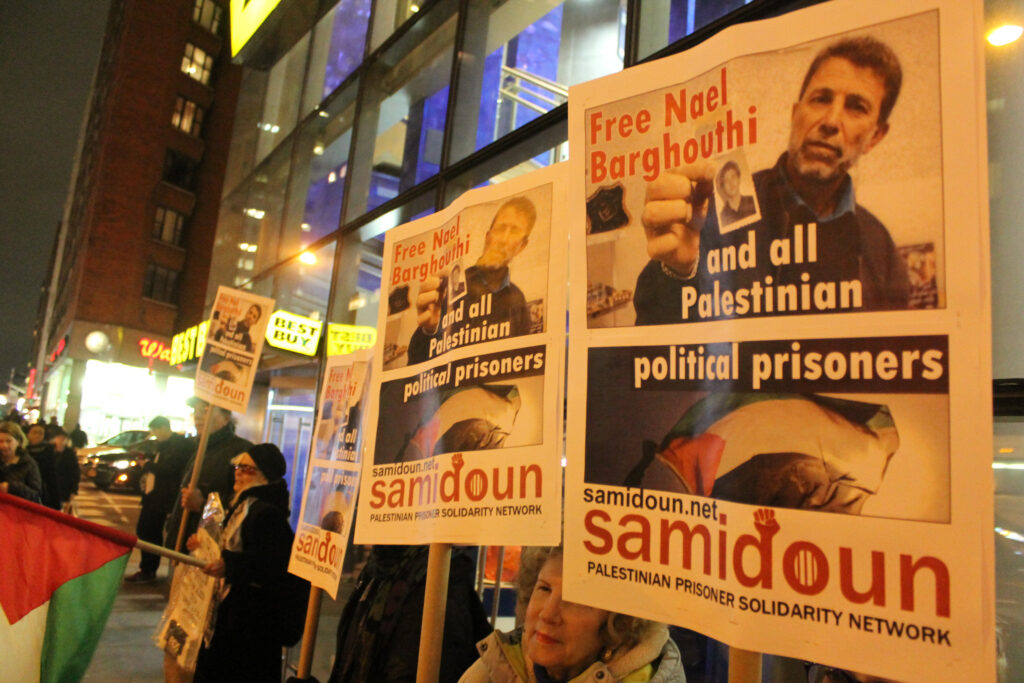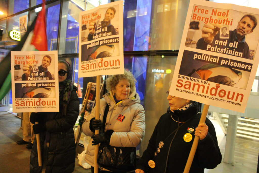 Samidoun Palestinian Prisoner Solidarity Network organized the protest, which highlighted the case of Nael Barghouthi. The 59-year-old Barghouthi is the longest-serving Palestinian prisoner in Israeli prisons. He is currently imprisoned while a secretive Israeli military commission decides whether to reimpose an earlier life sentence against him; he was freed in 2011 in the Wafa al-Ahrar prisoner exchange with over 1,000 fellow prisoners. In 2014, dozens of freed prisoners were rounded up in an attempt to pressure Palestinain resistance organizations; many of their sentences were reimposed on the basis of secret evidence and vague allegations of “connections with prohibited organizations,” including every major Palestinian party. Barghouthi’s sentence was not reimposed; instead, he was ordered to 30 months in prison, which ended on 17 December 2016.