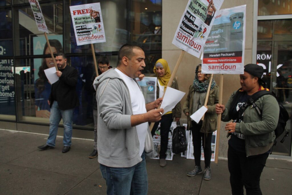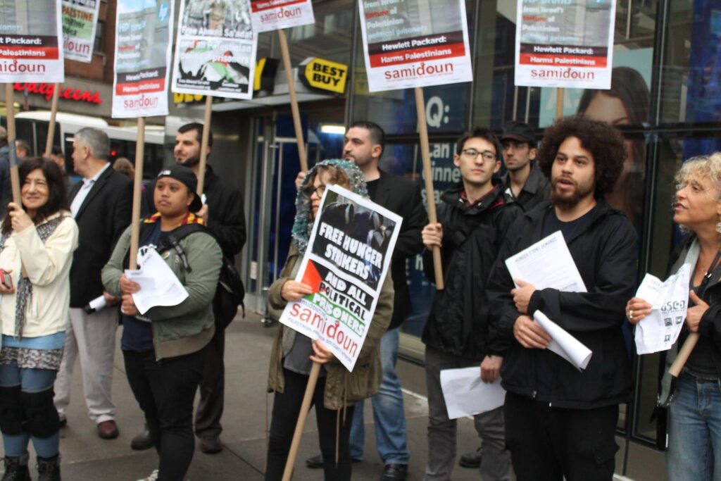 The rally took place outside of the Best Buy electronics store in Union Square; participants distributed flyers and materials highlighting the involvement of Hewlett-Packard corporation in profiting from Israeli apartheid, including maintaining the database system of the Israel Prison Service as well as HP’s contracts with the Israeli military and involvement with the apartheid system of checkpoints and ID cards. Participants called on customers to boycott HP and demand the corporation end its business with Israeli occupation and apartheid.
