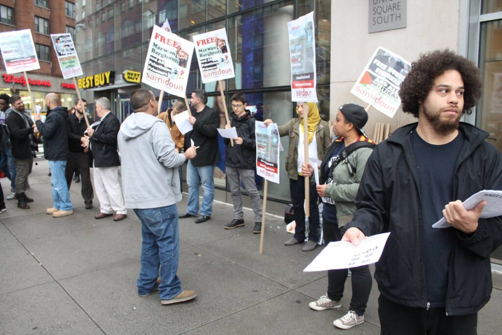 New York activists rallied on Friday, 5 May in support of Palestinian prisoners on hunger strike in Israeli prisons. The demonstration was organized by Samidoun Palestinian Prisoner Solidarity Network and American Muslims for Palestine-New Jersey.