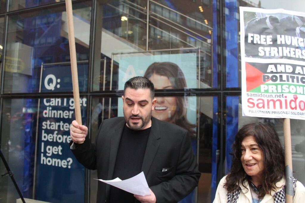 Joe Catron of Samidoun spoke at the close of the rally, urging people to participate on Friday, 12 May – the next Samidoun demonstration to support Palestinian prisoners, at 5:30 pm at the Best Buy in Union Square – and on Saturday, 13 May, for the Nakba Day Rally for Resistance and Return, organized in Leif Erickson Park in Bay Ridge, organized by the NY4Palestine coalition.
