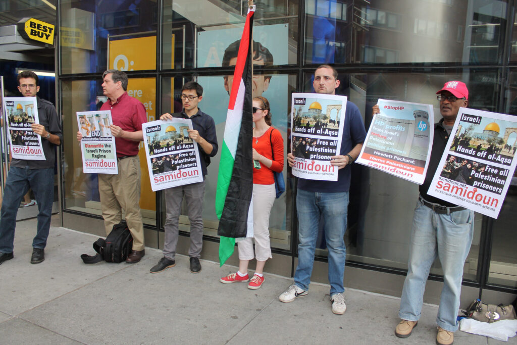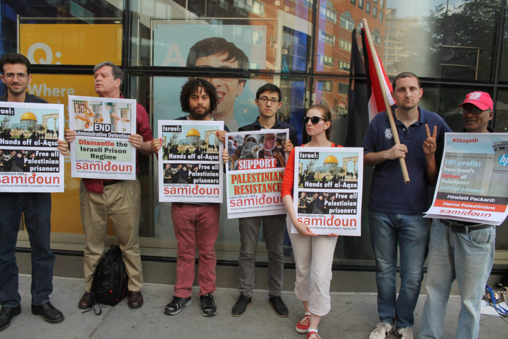 Samidoun activists in New York City protested in defense of Al-Aqsa Mosque from Israeli attack and for the freedom of Palestinian prisoners on Monday, 31 July. The protest was organized outside the Best Buy at Union Square, as part of the global campaign to boycott Hewlett-Packard products including laptops, printers, ink and other computer products because of HP corporations’ contracts with Israeli military and occupation entities, including the Israel Prison Service.