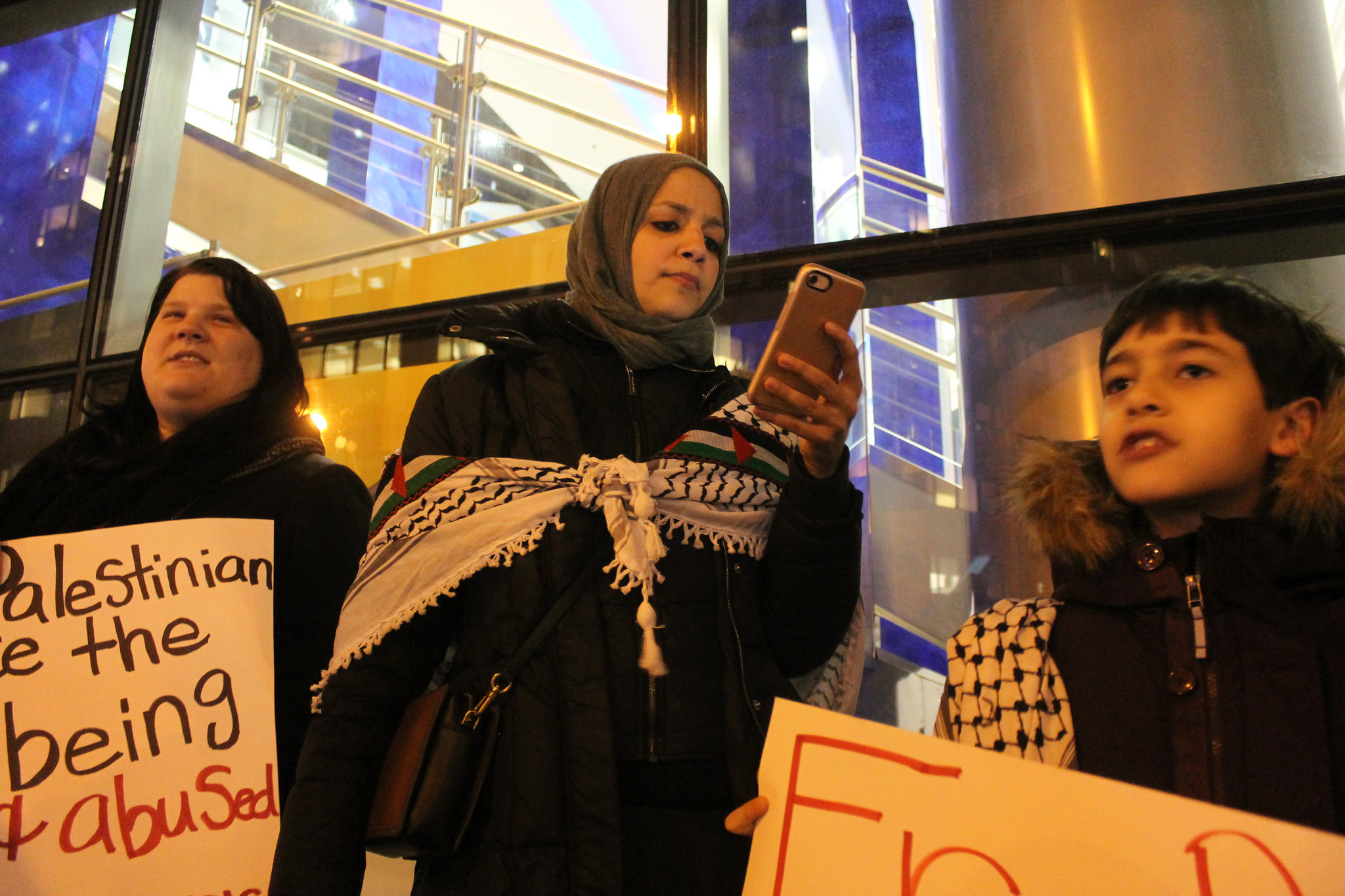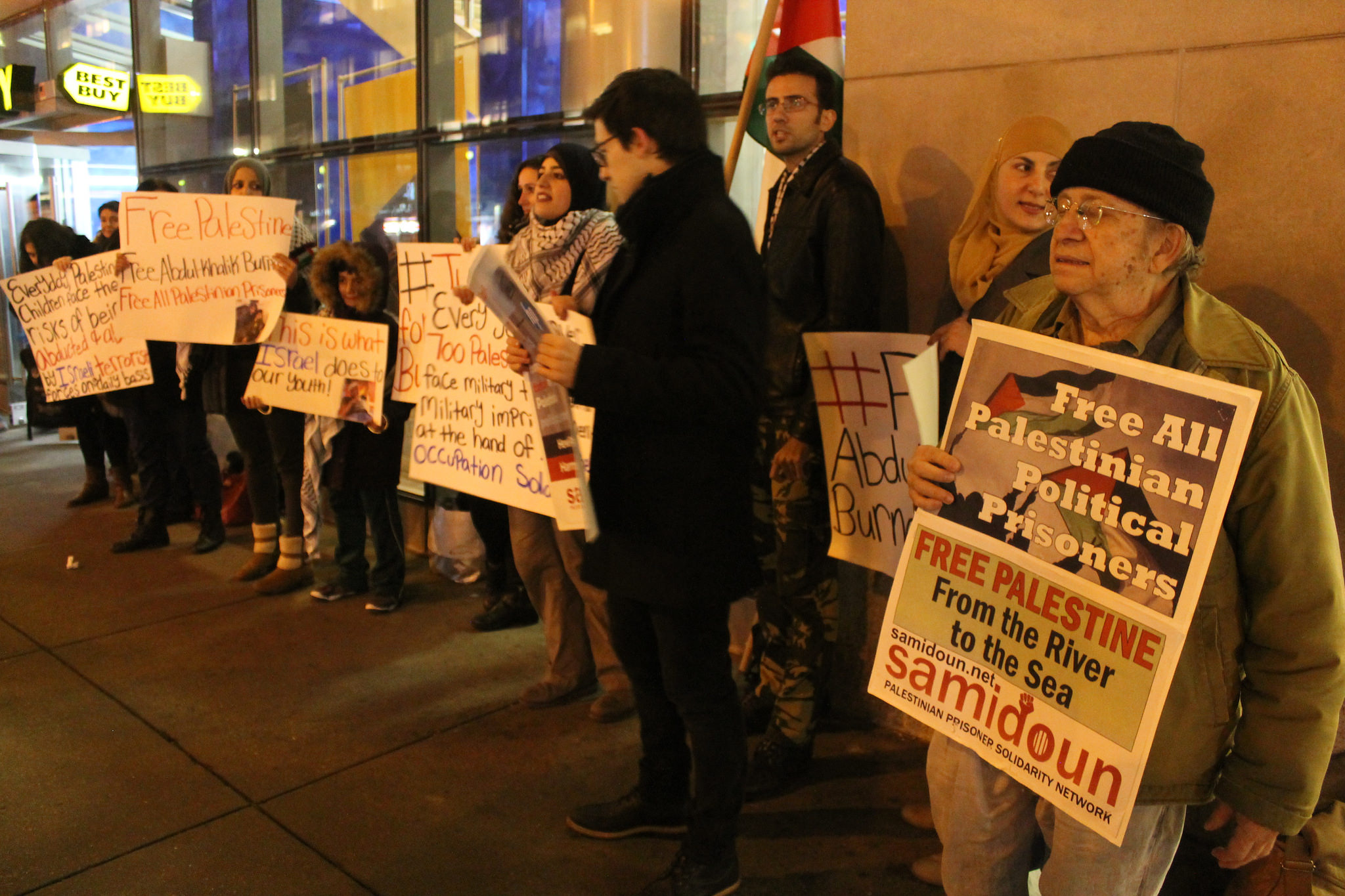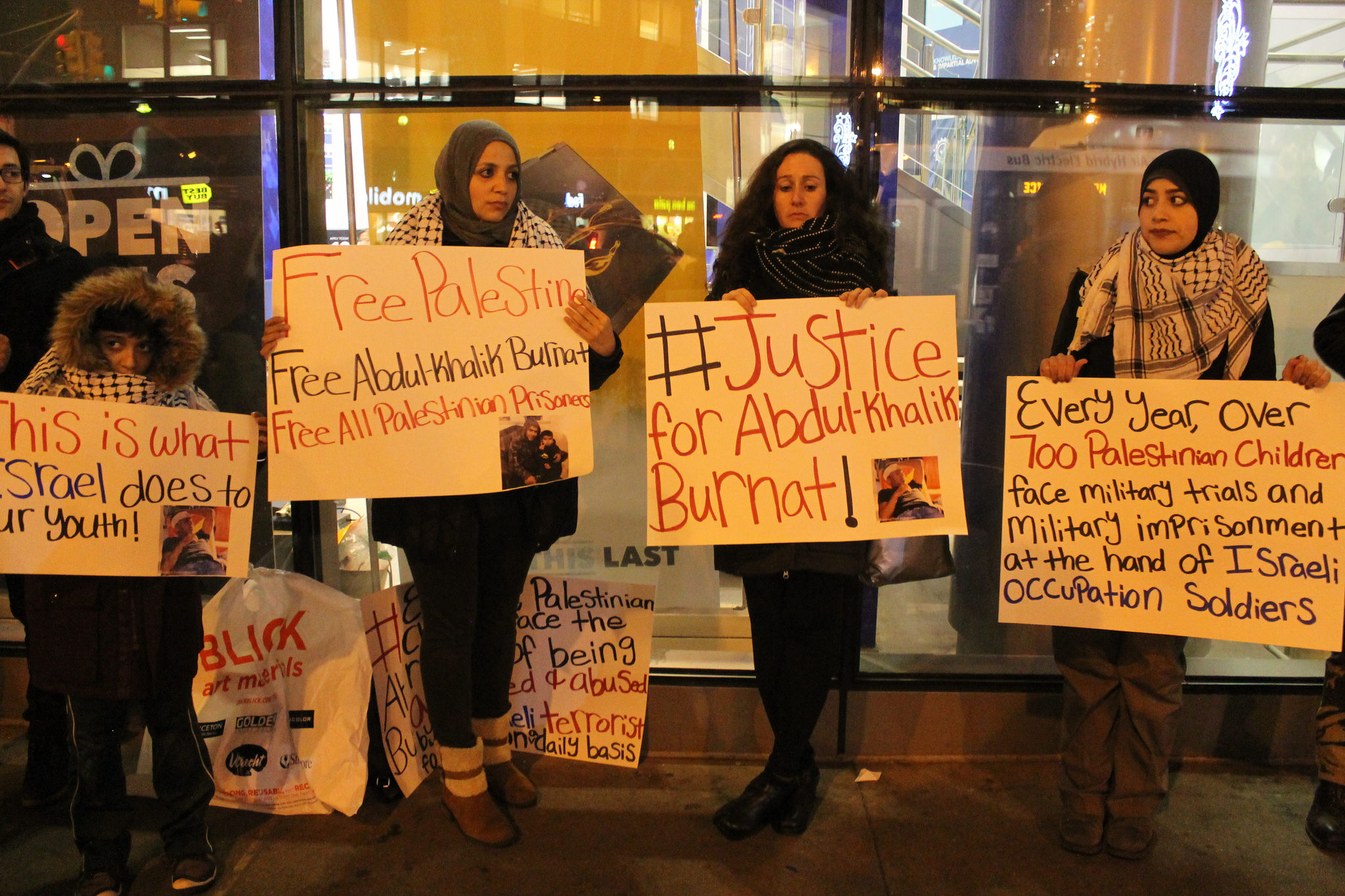 On Monday, 18 December, organizers in New York City protested outside the Best Buy electronics store in Union Square to demand freedom for Abdul-Khalik Burnat, a 17-year-old Palestinian from the village of Bil’in seized by the Israeli occupation on 10 December 2017. Abdul-Khalik was arrested with his two friends, Hamzah al-Khatib and Malik Rahdi; the three boys are now facing charges before an Israeli military court with an over 99 percent conviction rate, accused of “damaging” the Israeli apartheid wall.