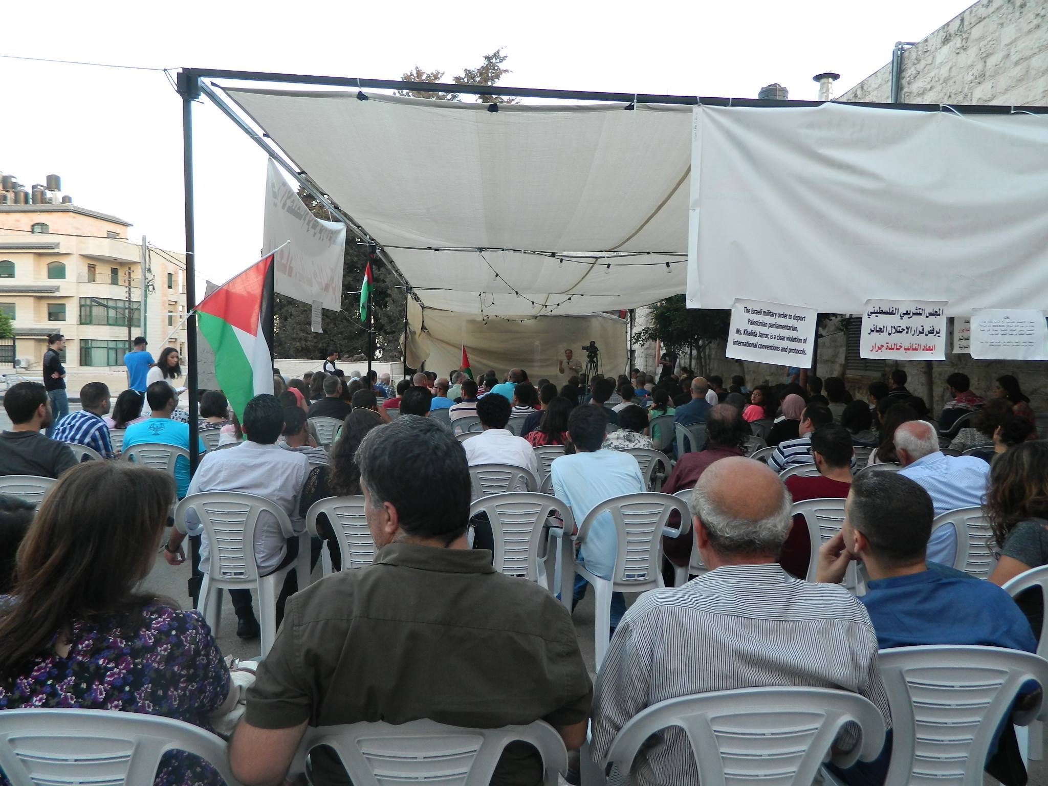 The protest tent organized by PLC member and political leader Khalida Jarrar outside the Palestinian Legislative Council building in Ramallah has just ended its second week of events and organizing. It has hosted a European delegation and numerous solidarity activists, as well as a number of forums, events and political activities, turning the tent of resistance to expulsion into a political events center in Ramallah.