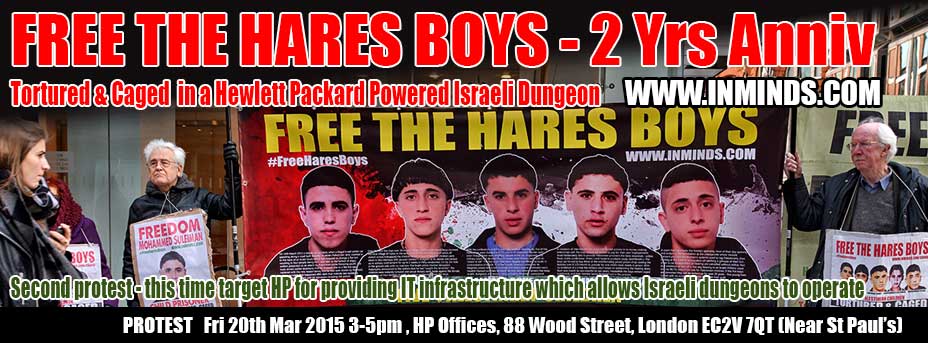 Five Palestinian children have been tortured and caged by Israel for 2 years for a crime that didn’t even happen. Following the successful protest on friday 13th March, please join us on this second protest for the second anniversary of their abduction as we demand justice for the Hares Boys, outside the London headquarters of Hewlett Packard who provide the IT infrastructure and systems that ensures Israel’s torture dens and dungeons stay operational. These include Israel’s notorious Al-Jalame interrogation centre, where the children were savagely tortured, and Israel’s Megiddo prison where the children have been caged for two years.