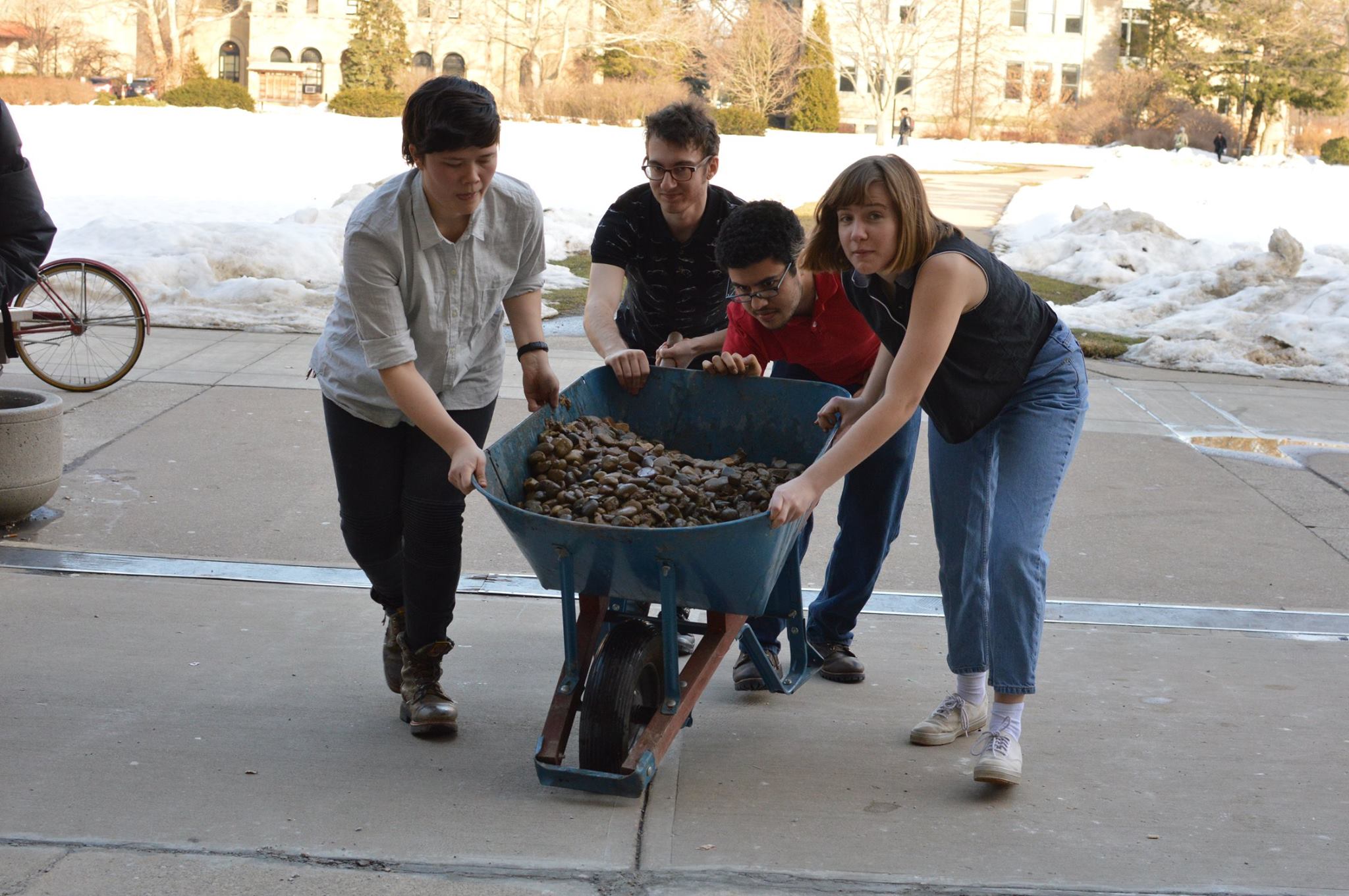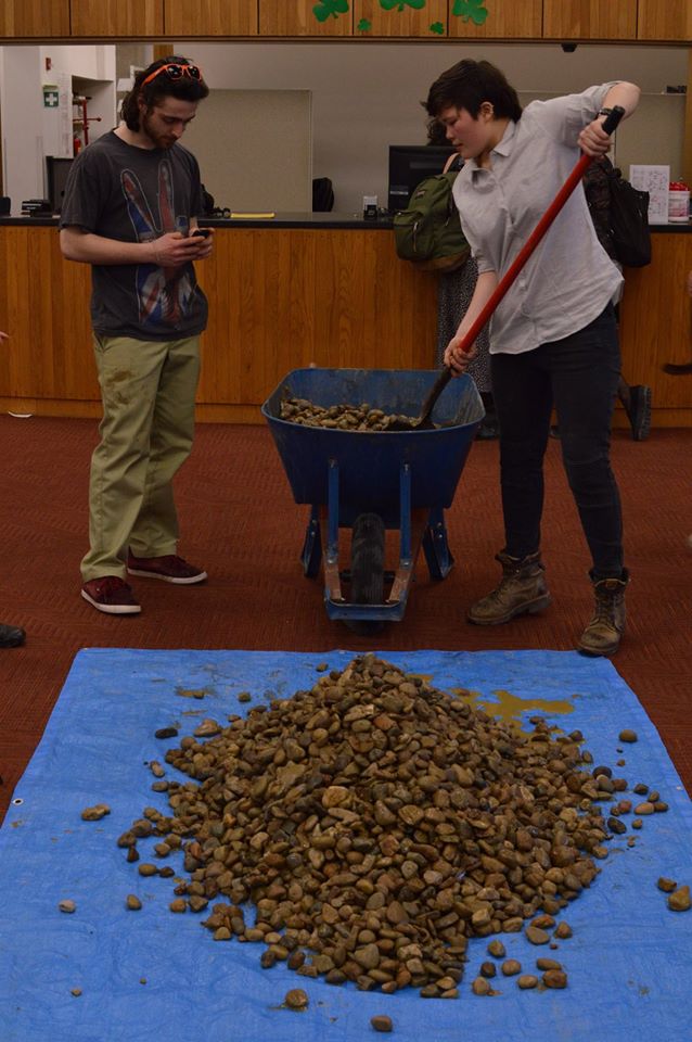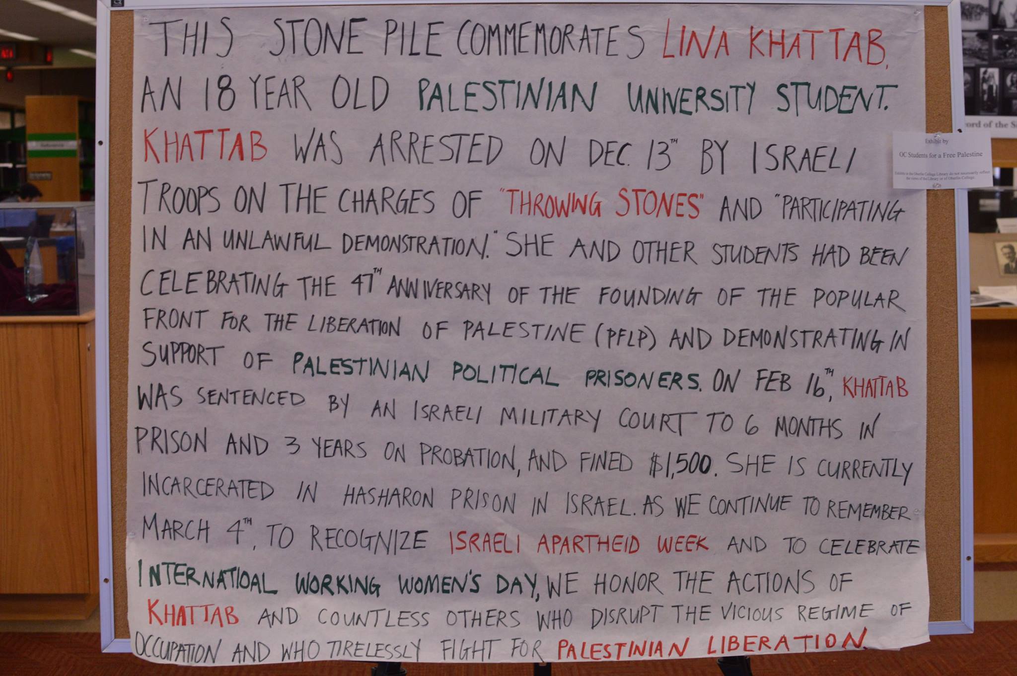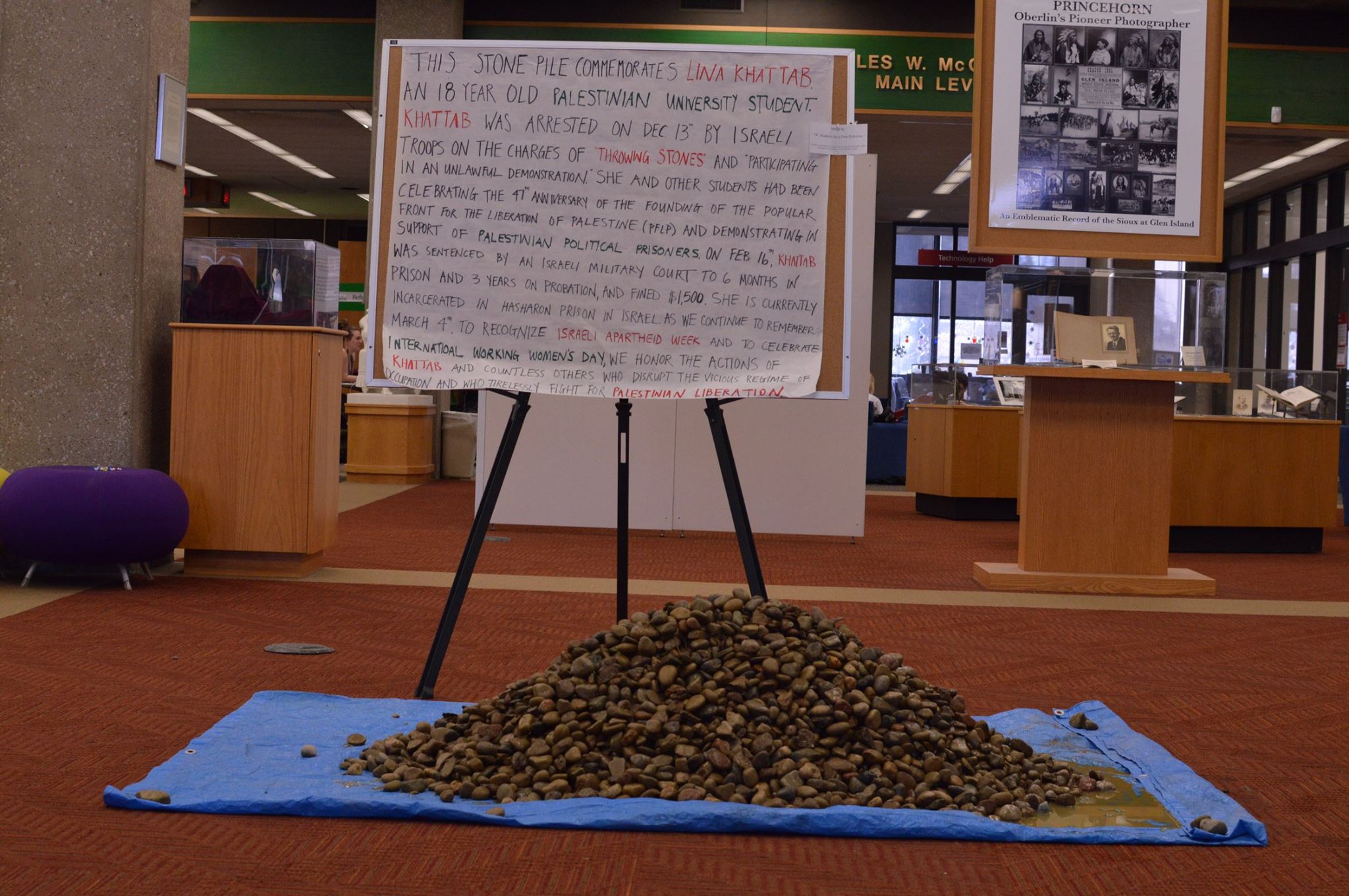 Oberlin Students for a Free Palestine mounted a week-long exhibition at Oberlin College’s Mudd Library on March 9, highlighting the case of imprisoned Palestinian student Lina Khattab and urging her immediate freedom. The exhibit, a “stone pile” with accompanying text, greets students and visitors as they enter the library. “These rocks symbolize the resistance embodied by Khattab and other Palestinians living under occupation,” said SFP.