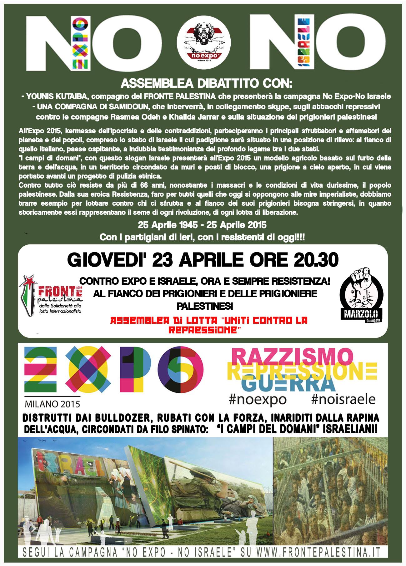 Expo 2015 is a festival of hypocrisy and lies, that showcases major exploitwers who starve the planet and peoples of the world. This includes the Israeli state, whose pavilion is located in a prominent position alongside that of Italy, the host country, in a testament to the “deep bond” between the two states. The theme of Israel’s presentation at the Expo, “the fields of tomorrow,” aims to present Israel as an agricultural model when it is in fact based on the theft of land and water, surrounding occupied lands with walls and imprisoning people in an open-air prison while carrying out a project of ethnic cleansing. The Palestinian people have endured this situation, despite massacres and harsh conditions, for over 66 years, and their heroic resistance is a beacon now for all those who oppose imperialism. We must struggle against those who exploit us and stand with the Palestinian prisoners; historically, prisoners are the seed of every revolution and liberation struggle.