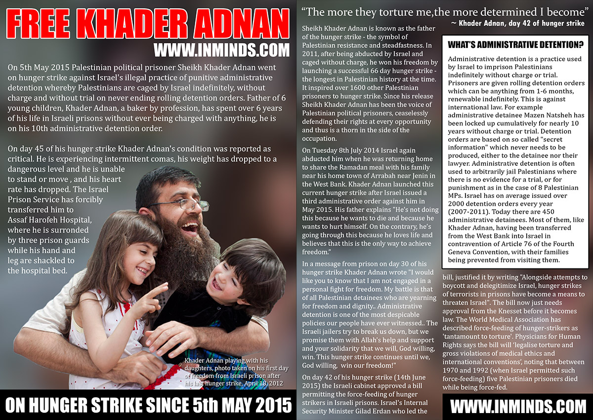 On day 42 of his hunger strike (14th June 2015) the Israeli cabinet approved a bill permitting the force-feeding of hunger strikers in Israeli prisons. Israel’s Internal Security Minister Gilad Erdan who led the bill, justified it by writing “Alongside attempts to boycott and delegitimize Israel, hunger strikes of terrorists in prisons have become a means to threaten Israel”. The bill now just needs approval from the Knesset before it becomes law. The World Medical Association has described force-feeding of hunger-strikers as ‘tantamount to torture’. Physicians for Human Rights says the bill will ‘legalise torture and gross violations of medical ethics and international conventions’, noting that between 1970 and 1992 (when Israel permitted such force-feeding) five Palestinian prisoners died while being force-fed.
