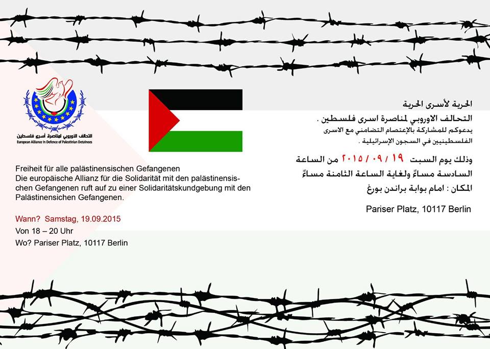 The European Alliance for Solidarity with Palestinian Detainees will hold a solidarity protest in support of the Palestinian prisoners on Saturday, 19 September at 6:00 pm.