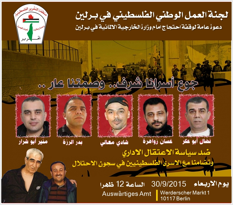 Rally in solidarity with Palestinian prisoners on hunger strike against the policy of administrative detention, arrest and imprisonment without charge or trial, on Wednesday, September 30 at 12:00 noon in front of the German Foreign Office, Werderscher Markt 1, 10117 Berlin