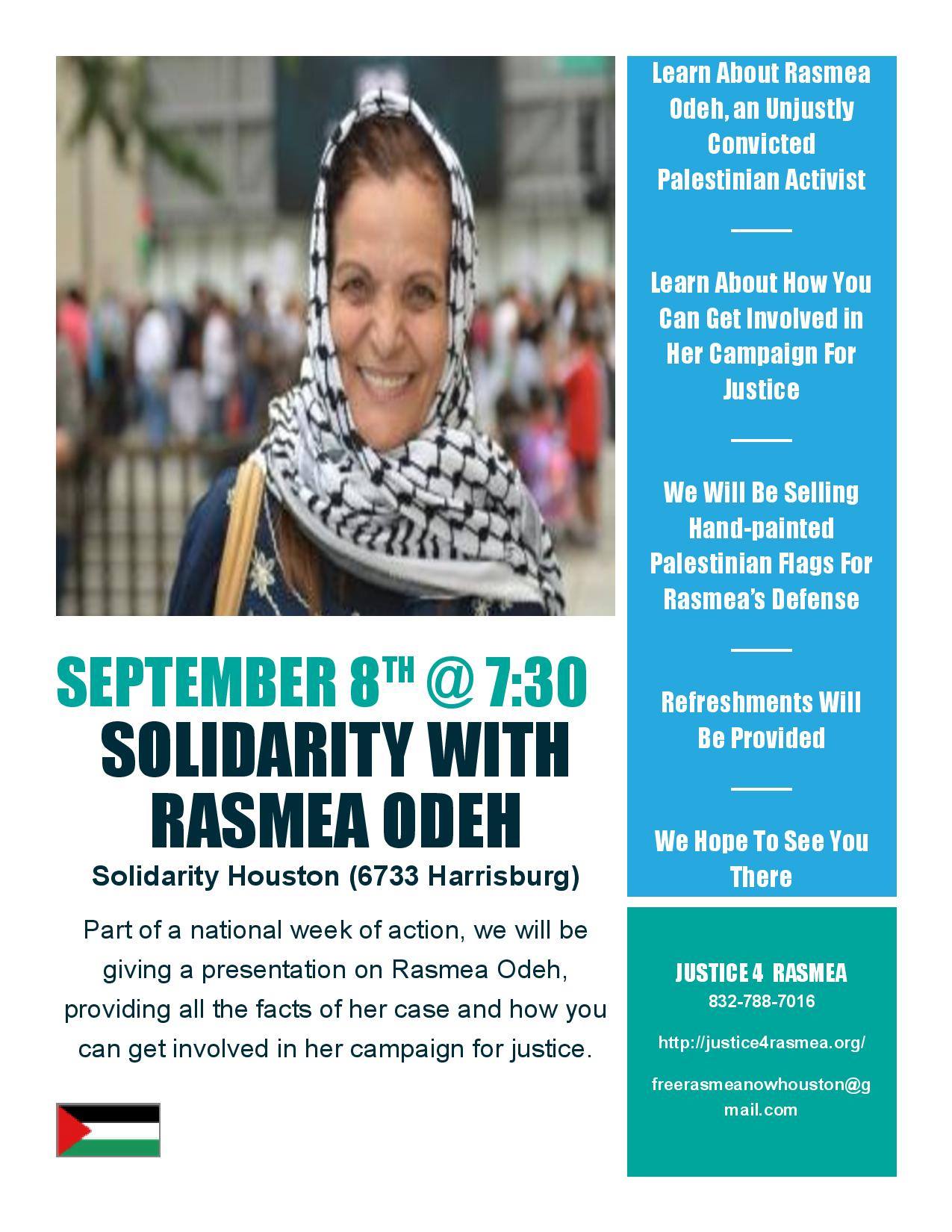 You can find more information about Rasmea and the campaign to free her on the Free Rasmea Now Facebook page. We hope you will join us!