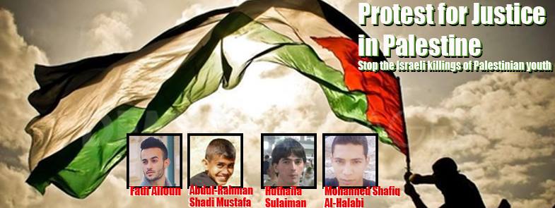 International law recognizes the right of Palestinians, like any occupied people, to resist. Stand with us as we stand up for justice in Palestine and say no to the killings of Huthaifa Sulaiman (18), Fadi Alloun (19), Abdul-Rahman Shadi Mustafa (13), and Mohannad Shafiq al-Halabi (19).