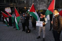 Demonstrators rallied in Dag Hammarskjöld Plaza on Monday, 23 November to mark the United Nations’ International Day of Solidarity with the Palestinian People and protest the UN’s contracts with British-Danish security company G4S, which also equips Israeli checkpoints, detention centers, military and police forces, and prisons. The demonstration, organized by Samidoun: Palestinian Prisoner Solidarity Network, was the first event in a global week of protests demanding the UN end its ties to the company.