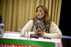 The first session, titled “The Struggle of Palestinian Prisoners,” was moderated by Kutlu Dane. The session’s first speaker was Amneh Muna, who was sentenced to life in prison in 2001 by the occupying powers before participating in a hunger strike to protest solitary confinement in 2007. Muna was subsequently released in 2011 as part of a prisoner swap between Hamas and Israel before going into exile. “I’m going to discuss with you the daily life of the prisoners there, because daily life for the prisoners is even a struggle,” Muna said, noting that she lost everything suddenly and that the struggle started the moment one was arrested.