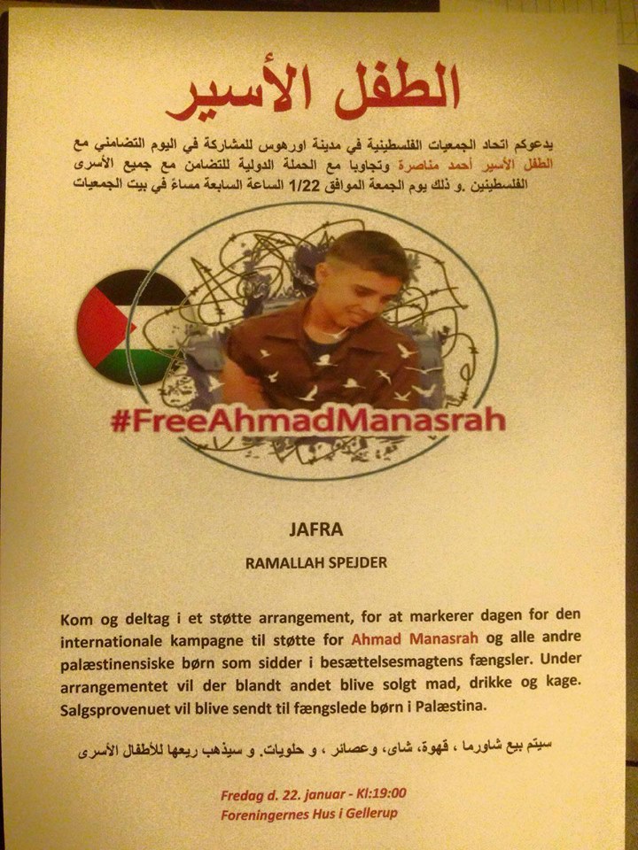 Danish and Palestinian activists in Denmark will commemorate the 14th birthday of Palestinian child prisoner Ahmad Manasrah on Friday, 22 January, gathering to discuss the situation of the hundreds of Palestinian children imprisoned in Israeli jails.