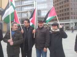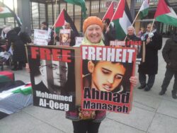 Demonstrators gathered at Potsdamer Platz in Berlin on Friday, 29 January, to call for freedom for Palestinian prisoners, particularly Mohammed al-Qeeq, the Palestinian journalist imprisoned without charge or trial who has been on hunger strike for 66 days and is currently in critical condition; and Ahmad Manasrah, the 14-year-old Palestinian boy whose injury, imprisonment and interrogation were seen on video around the world.