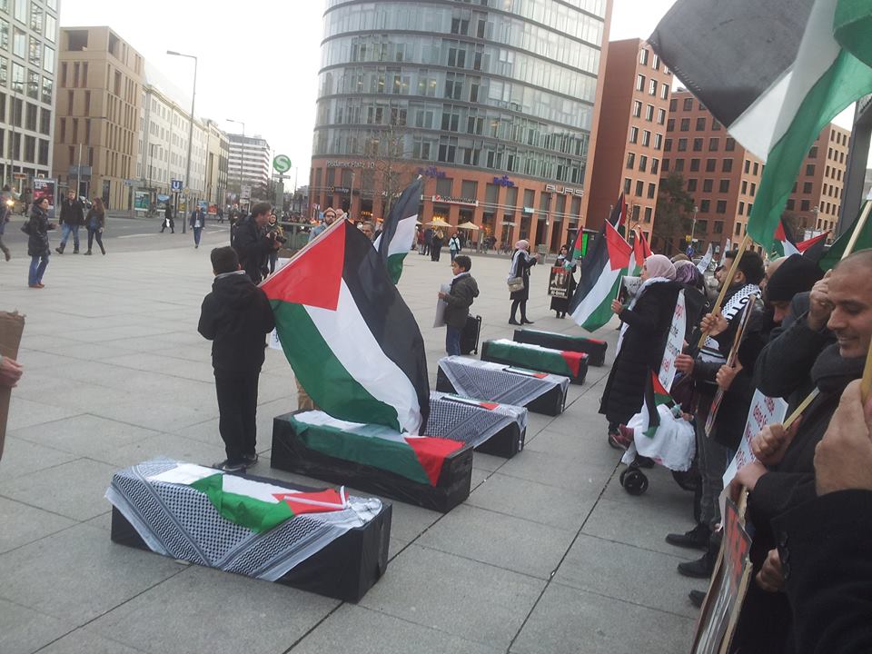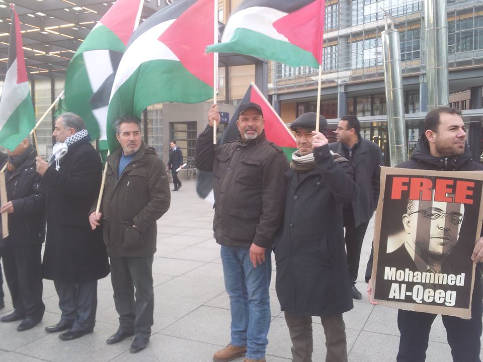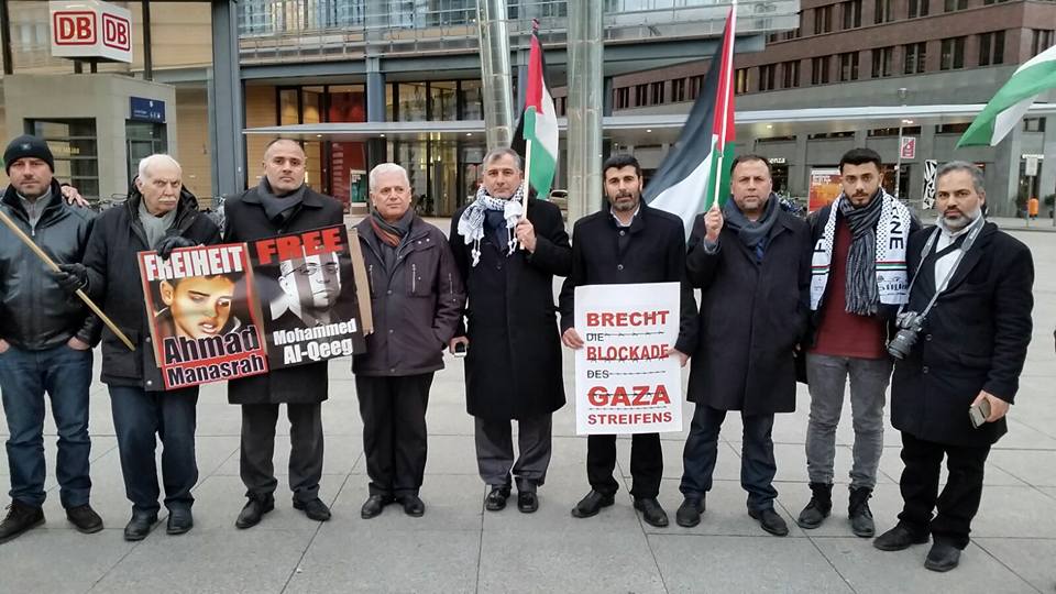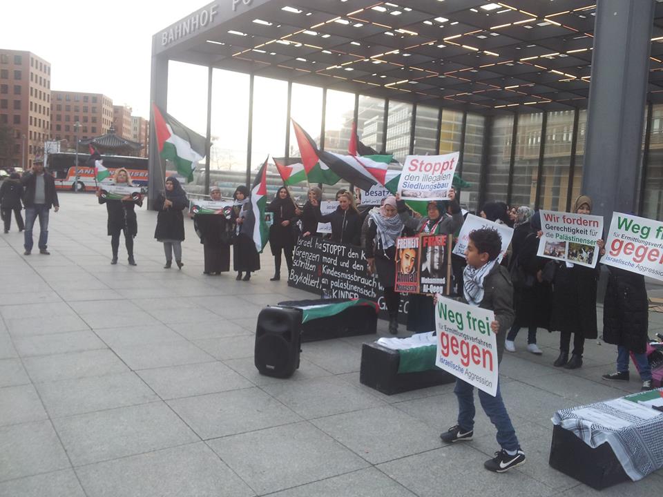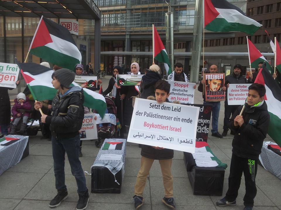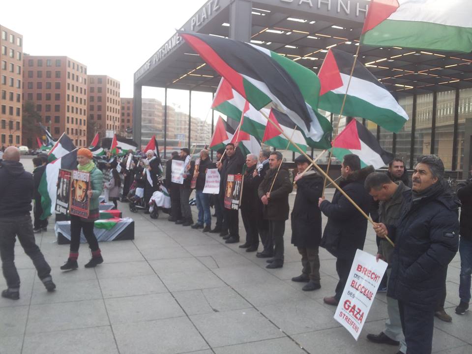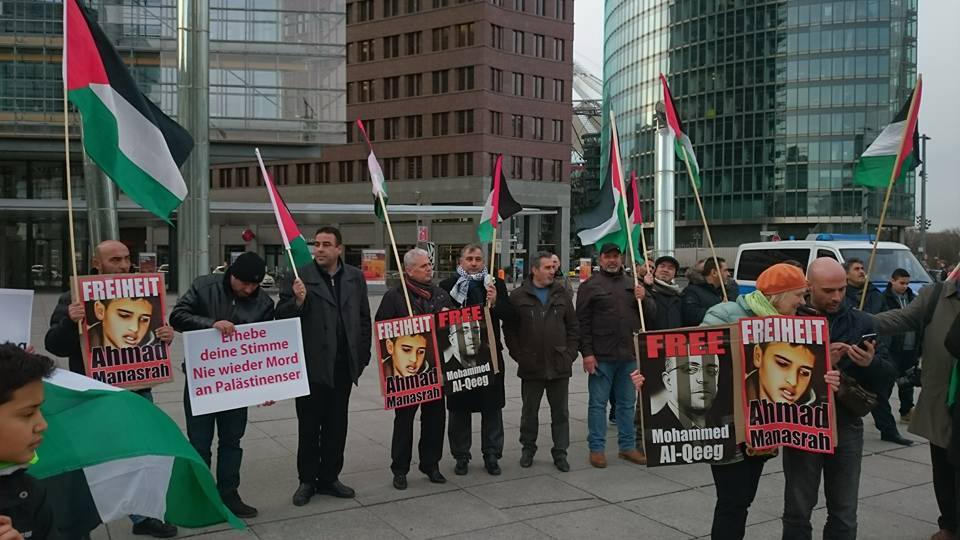 Demonstrators gathered at Potsdamer Platz in Berlin on Friday, 29 January, to call for freedom for Palestinian prisoners, particularly Mohammed al-Qeeq, the Palestinian journalist imprisoned without charge or trial who has been on hunger strike for 66 days and is currently in critical condition; and Ahmad Manasrah, the 14-year-old Palestinian boy whose injury, imprisonment and interrogation were seen on video around the world.