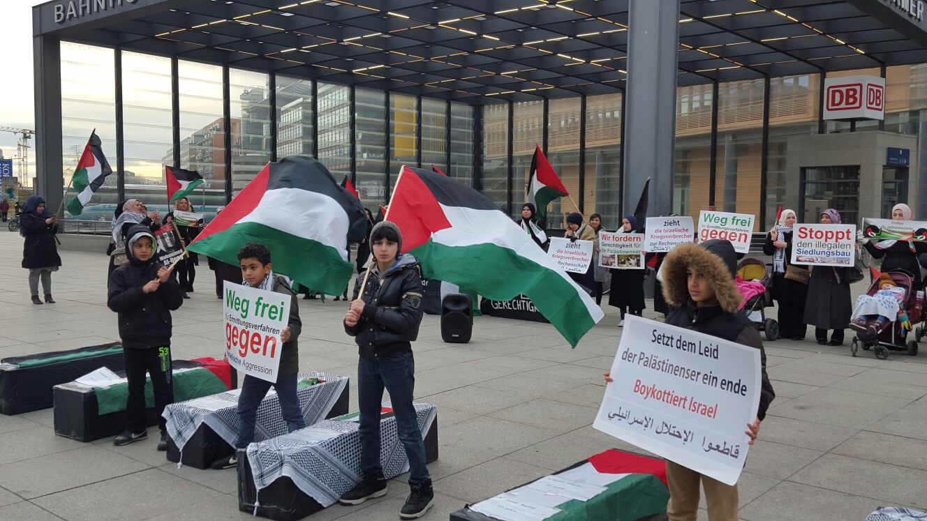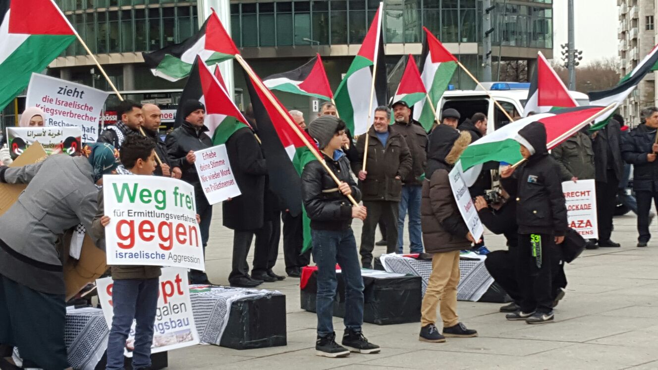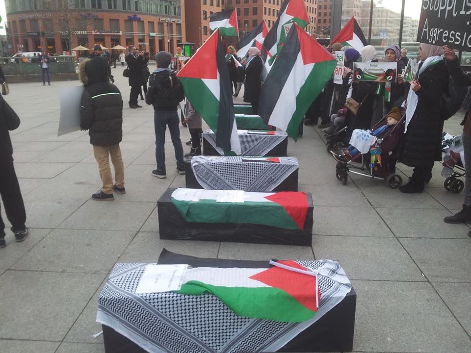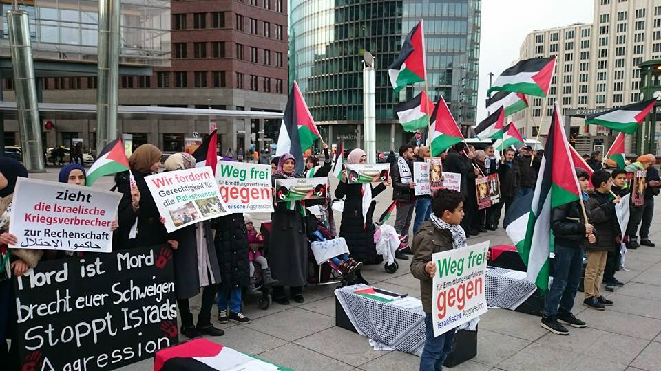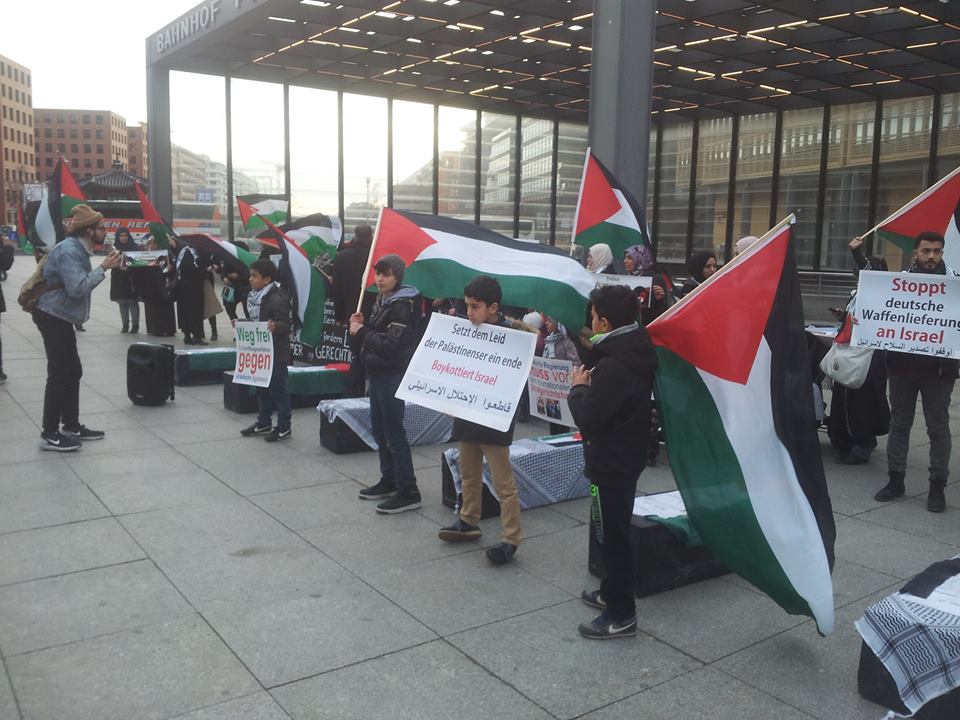 Demonstrators gathered at Potsdamer Platz in Berlin on Friday, 29 January, to call for freedom for Palestinian prisoners, particularly Mohammed al-Qeeq, the Palestinian journalist imprisoned without charge or trial who has been on hunger strike for 66 days and is currently in critical condition; and Ahmad Manasrah, the 14-year-old Palestinian boy whose injury, imprisonment and interrogation were seen on video around the world.