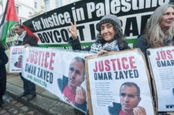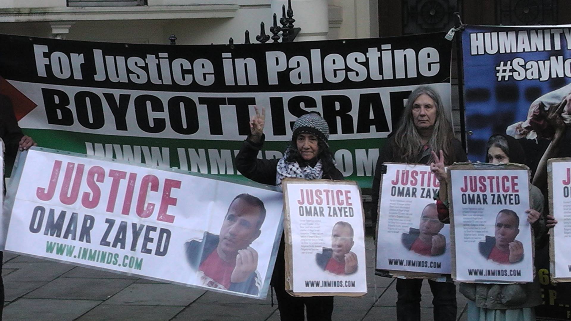 They then traveled to the Palestinian embassy in London in order to support his sanctuary in the Palestinian embassy and urge the Palestinian Authority to do its utmost to defend Omar, especially following various incidents in which PA officials have pressured him to leave the embassy. They spoke with Ambassador Manuel Hassassian, who joined the protesters and expressed his support for Omar Zayed, emphasizing that Palestinian officials must work actively in the international arena to defend Omar and ensure his safety and that he will not be put in danger.
