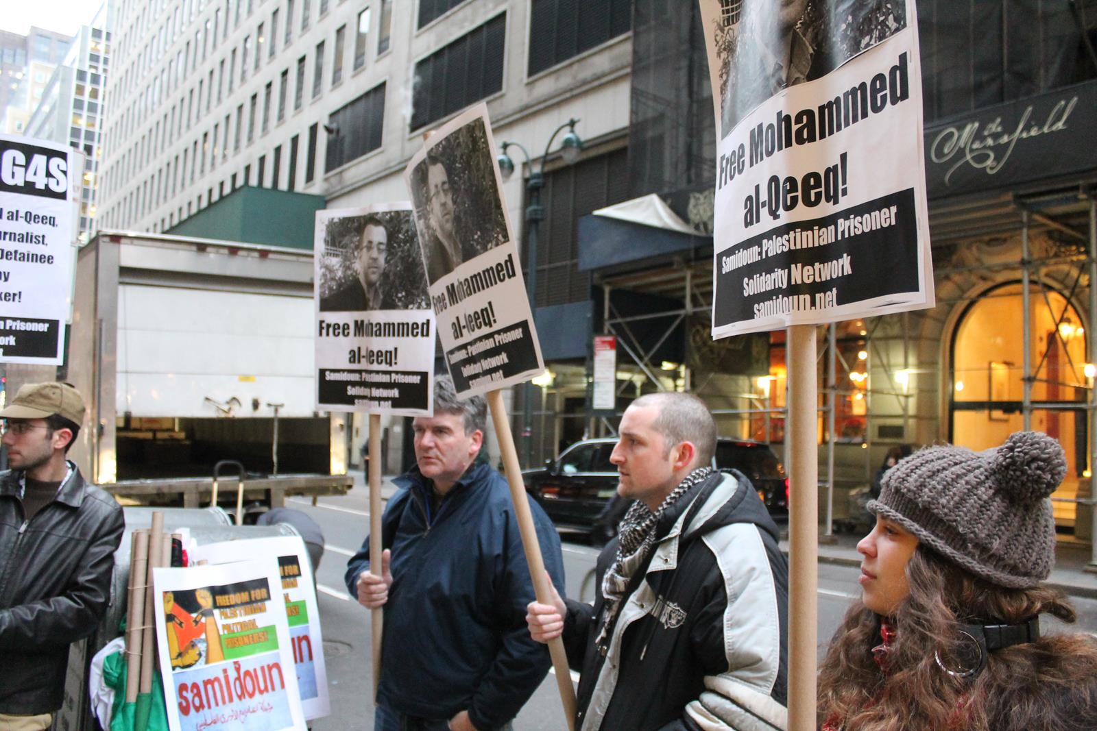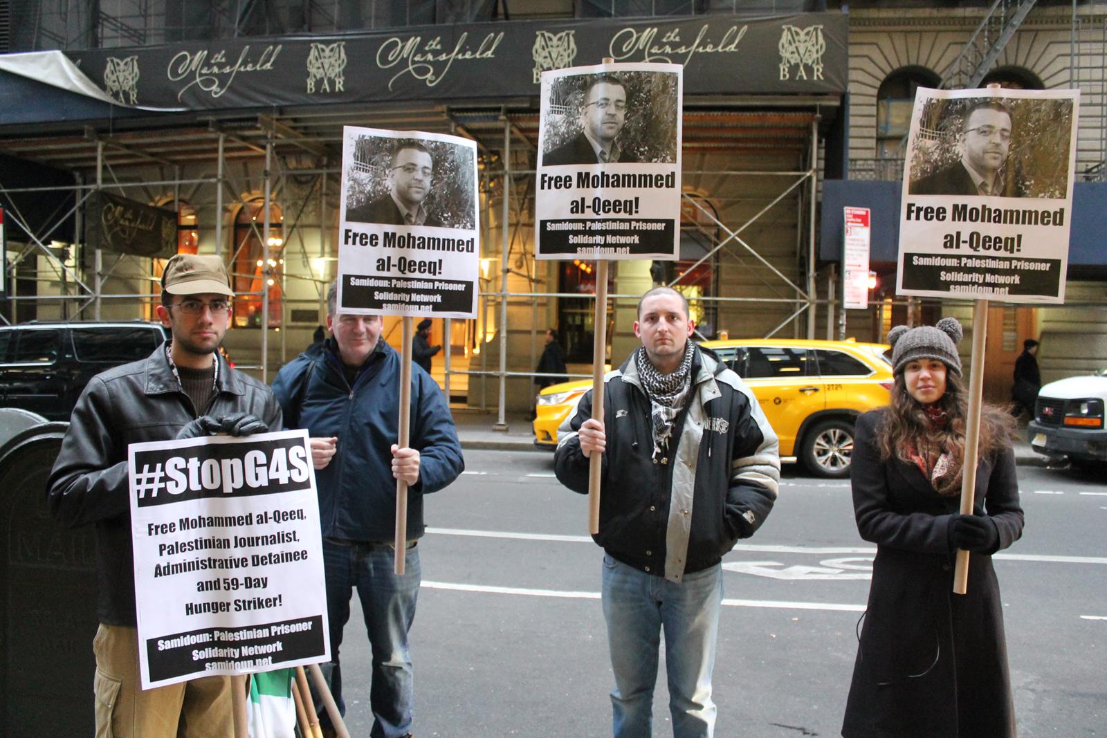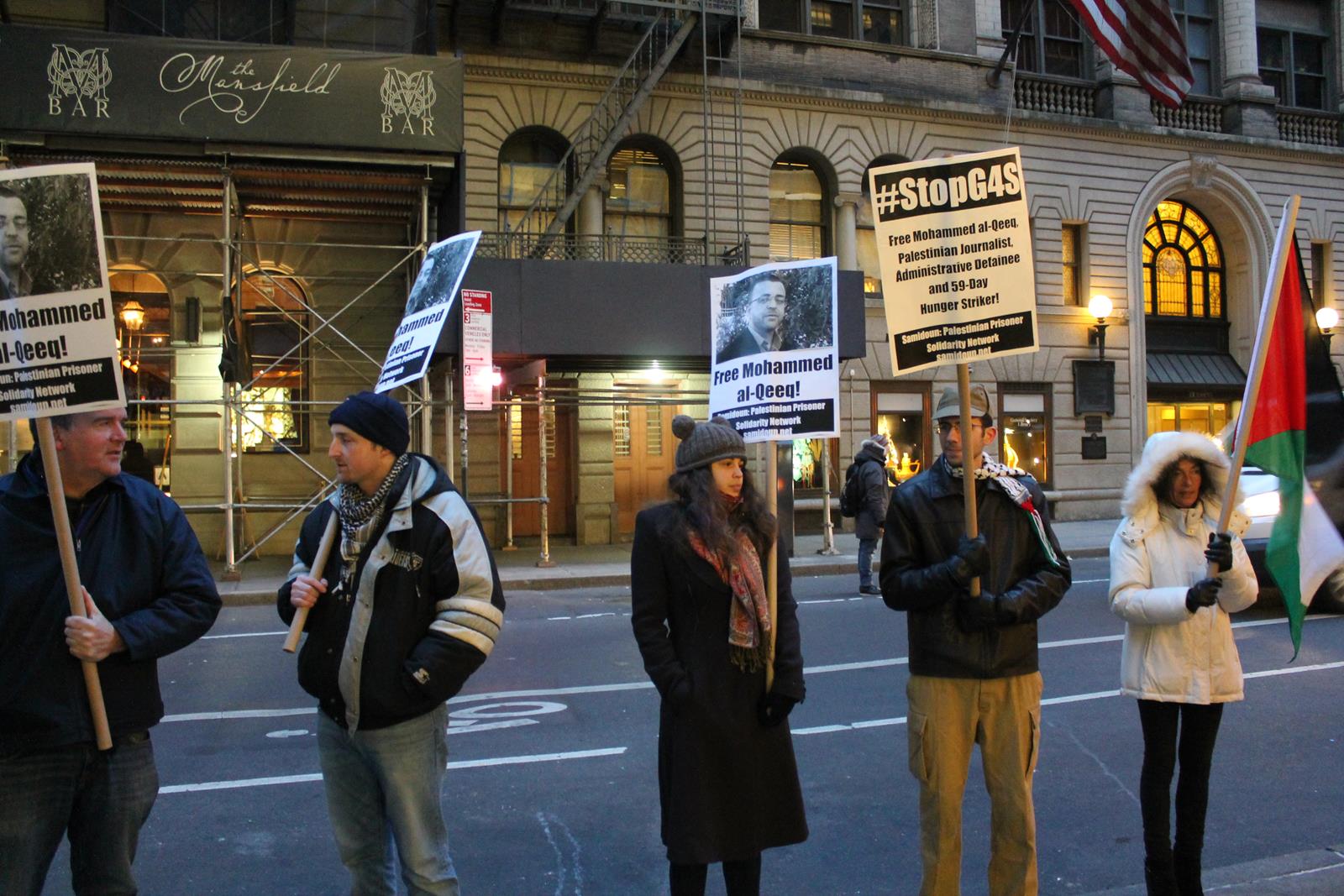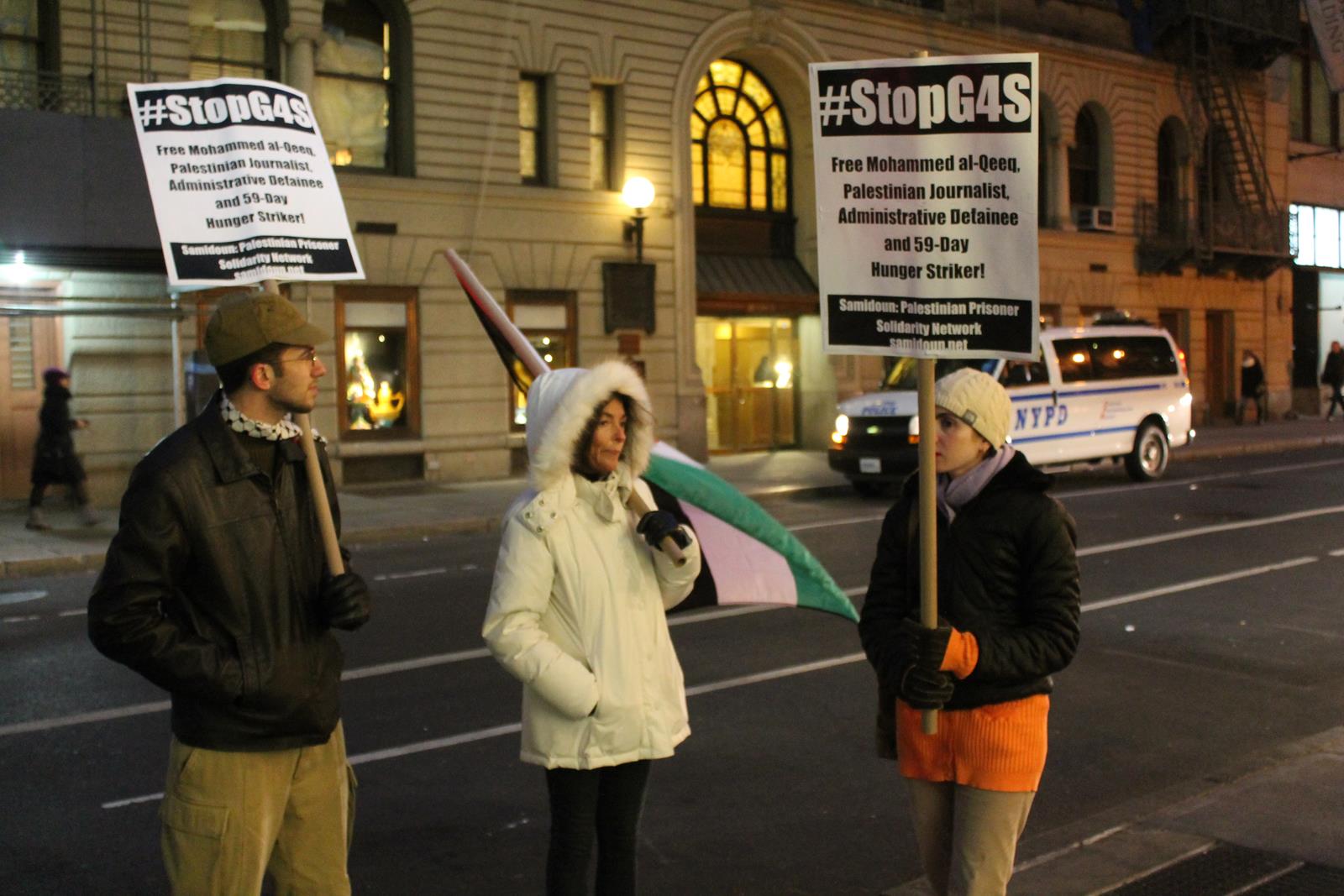 New Yorkers came out on Friday, 22 January – despite low temperatures and a threatened heavy snowstorm – to protest G4S‘s complicity in Israeli imprisonment, torture and oppression of Palestinians, and to call for freedom for imprisoned Palestinian journalist Mohammed al-Qeeq, on his 59th day of hunger strike against his detention without charge or trial.