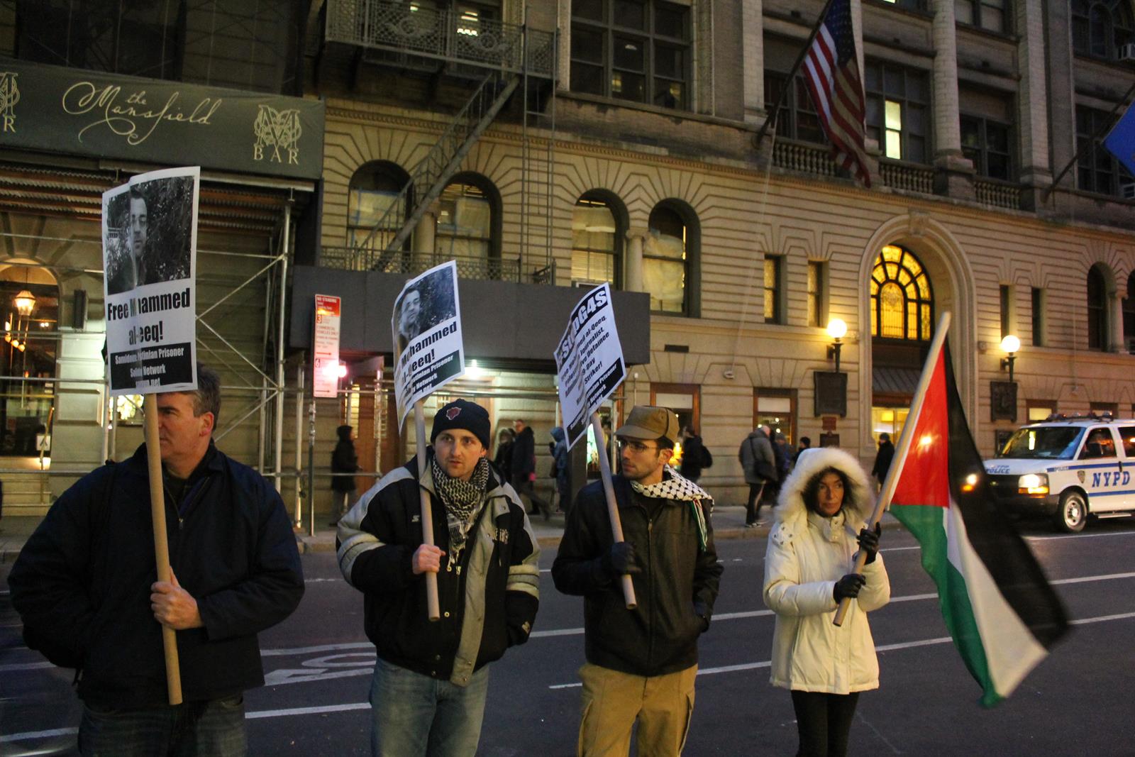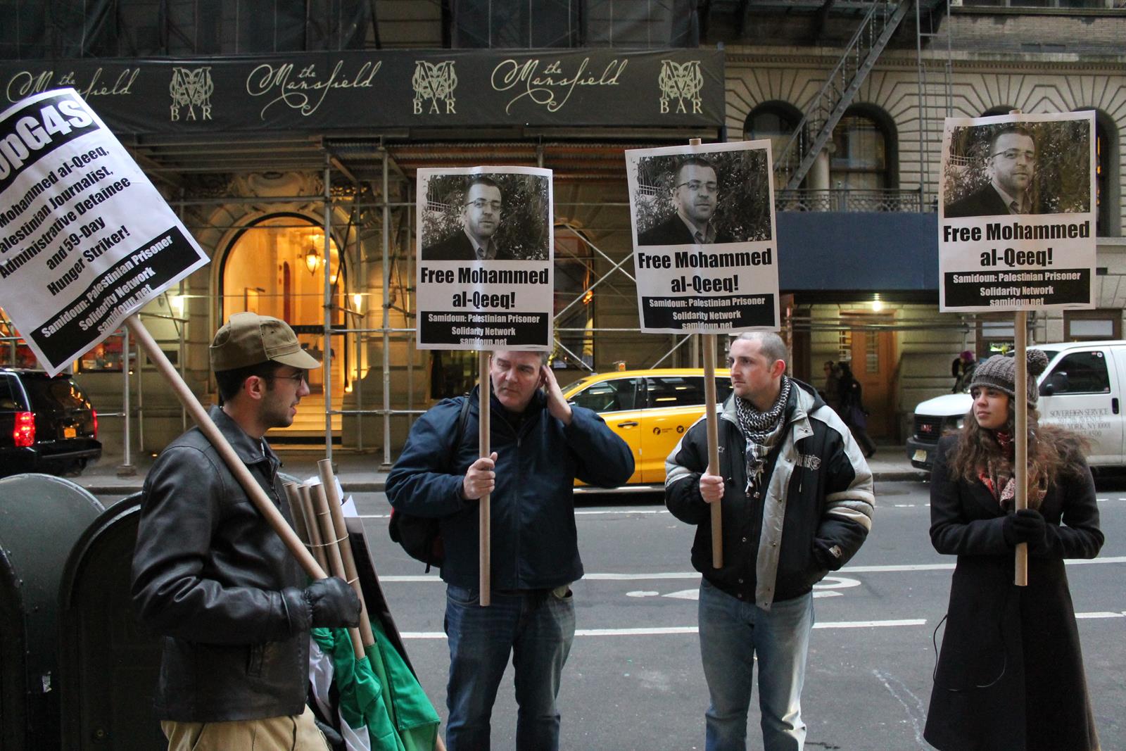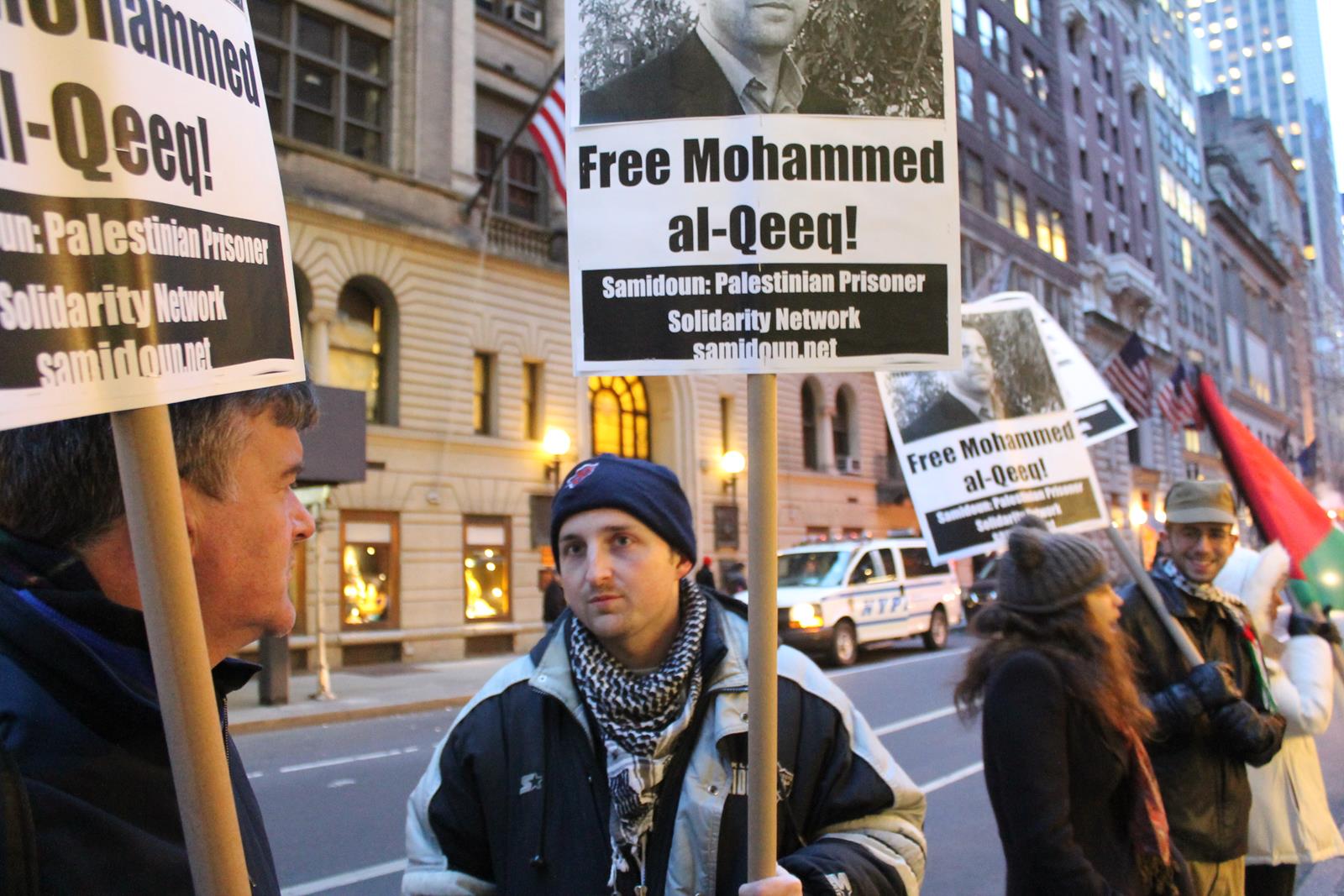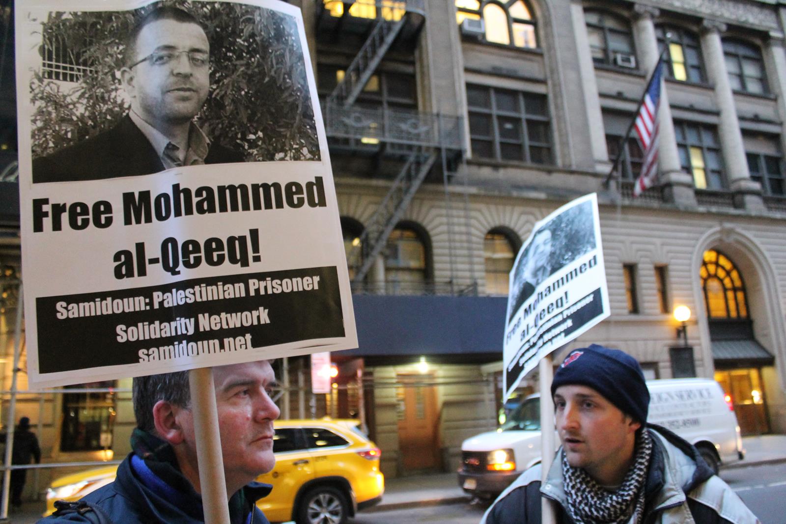 New Yorkers came out on Friday, 22 January – despite low temperatures and a threatened heavy snowstorm – to protest G4S‘s complicity in Israeli imprisonment, torture and oppression of Palestinians, and to call for freedom for imprisoned Palestinian journalist Mohammed al-Qeeq, on his 59th day of hunger strike against his detention without charge or trial.
