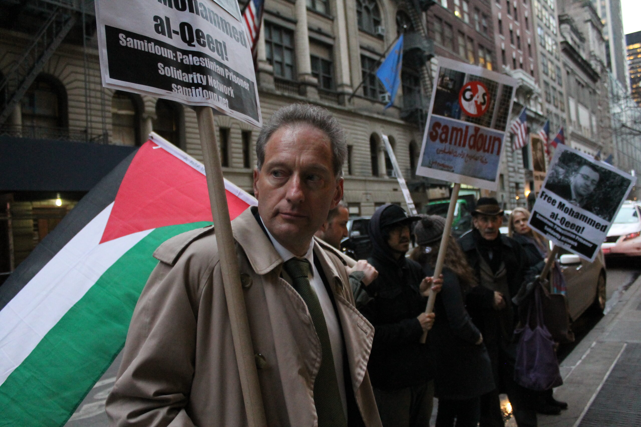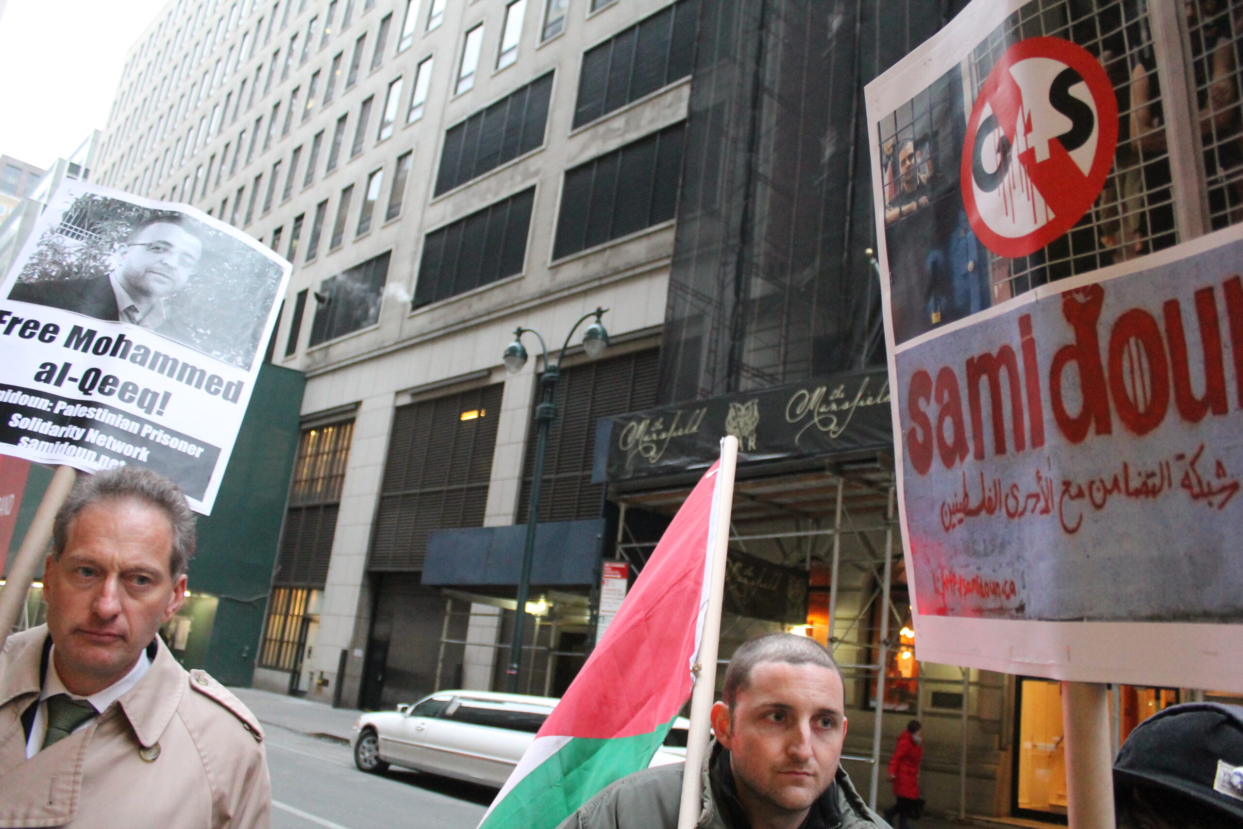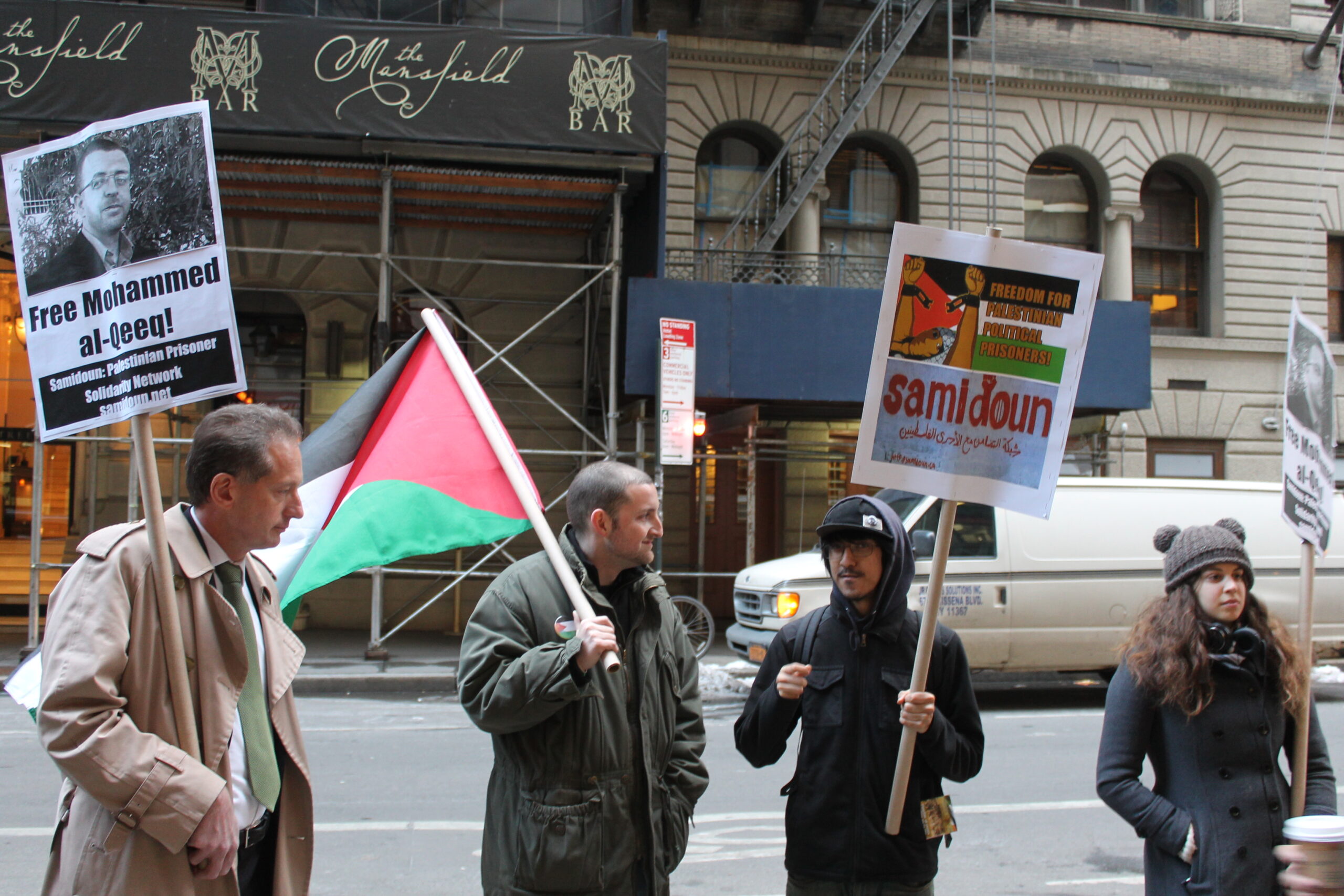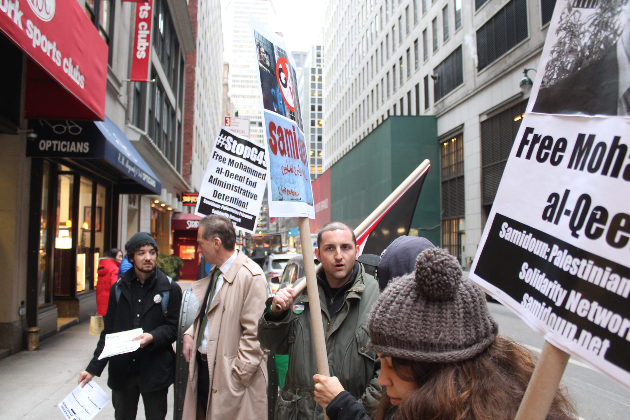 Organized by Samidoun Palestinian Prisoner Solidarity Network, the protest outside the New York City offices of G4S demanded al-Qeeq’s immediate release as well as an end to G4S’ contracts to provide security systems to Israeli prisons and checkpoints. Today’s New York City protest for Al-Qeeq joined events in London, Berlin, and in various towns and cities in Palestine.