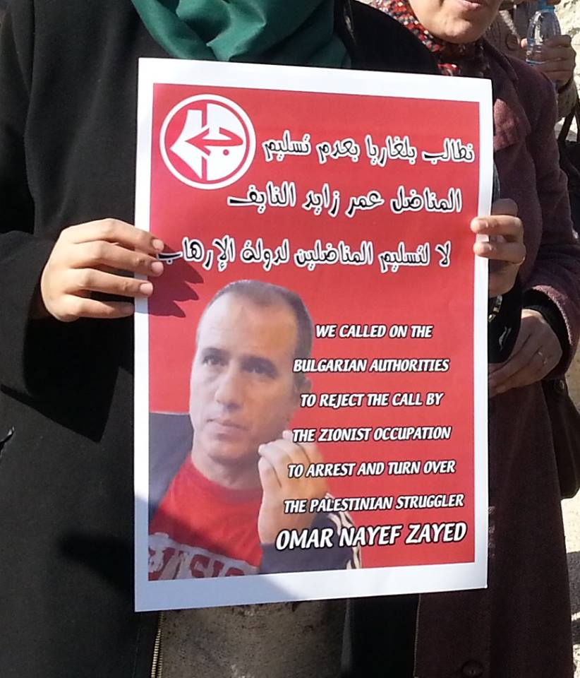 The protest came as part of an international week of action in solidarity with Zayed, with actions in Gaza, New York, London, Brussels, Berlin and elsewhere. The protests are united in demanding the Bulgarian government reject the extradition request against Zayed, who has taken refuge in the Palestinian embassy in Sofia. He has lived in Bulgaria for the past 22 years. His wife Rania and three children are Bulgarian citizens. Zayed escaped Israeli imprisonment in 1990 after a 40-day hunger strike.
