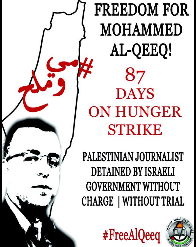 Join the General Union of Palestine Students (GUPS) at SFSU for a protest in solidarity with Mohammed al-Qeeq, imprisoned Palestinian journalist on hunger strike for 91 days against his administrative detention without charge or trial. Stand for freedom for al-Qeeq and all Palestinian prisoners!