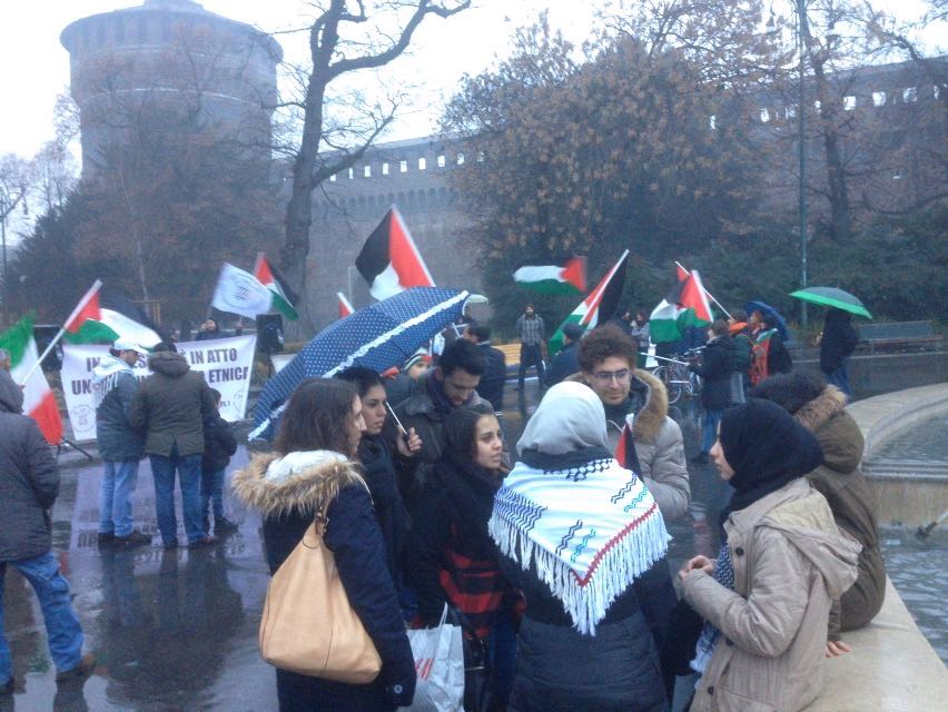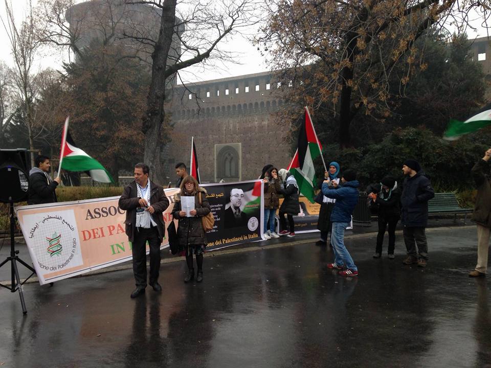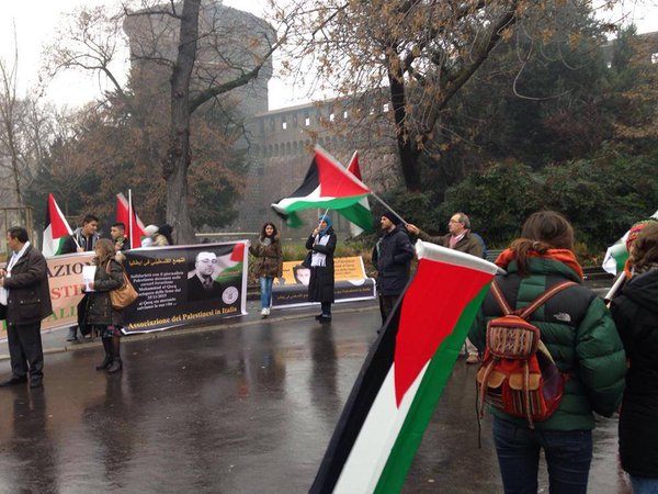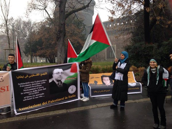 On Saturday, 30 January, the Association of Palestinians in Italy (Associazione dei Palestinesi in Italia) organized a protest at Piazza Castello in Milan, calling for freedom for imprisoned, hunger-striking Palestinian jourrnalist Mohammed al-Qeeq and an end to the siege on Gaza. Al-Qeeq, 33, has been on hunger strike since 25 November 2015 in protest of his torture and then administrative detention without charge or trial.