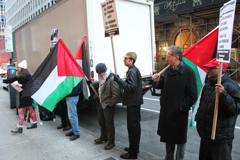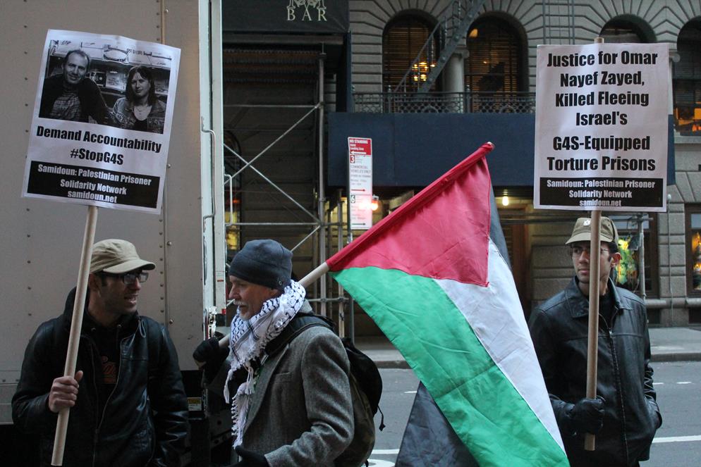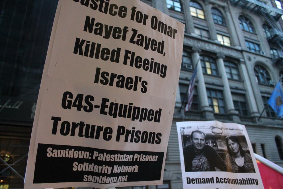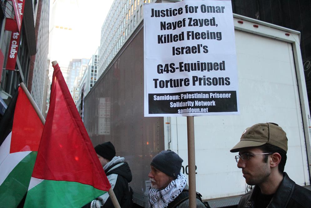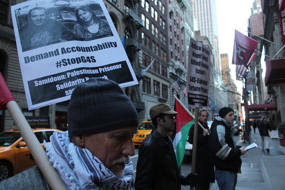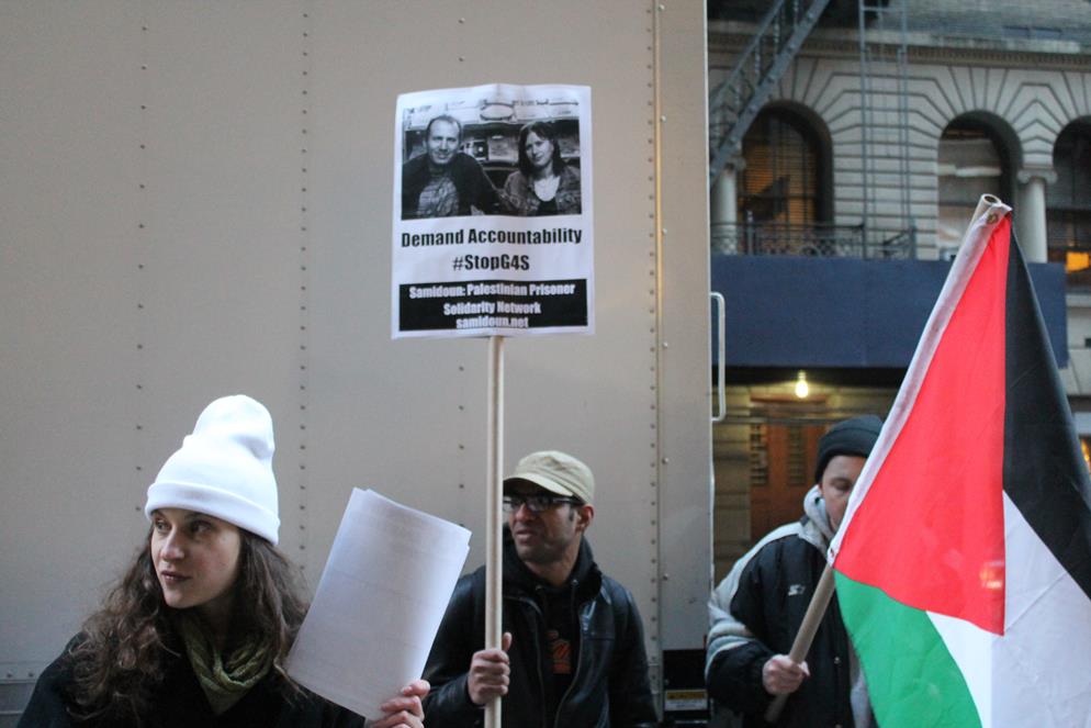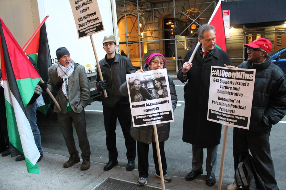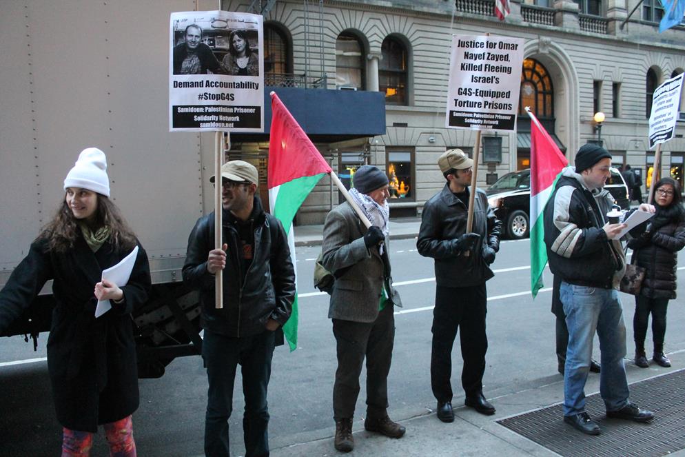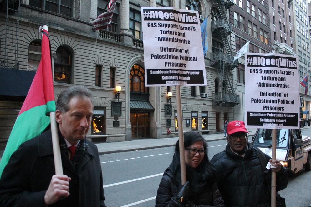 Activists in New York protested outside the offices of security multinational G4S on Friday, 26 February, in solidarity with Palestinian political prisoners, focusing on the cases of Mohammed al-Qeeq and Omar Nayef Zayed.