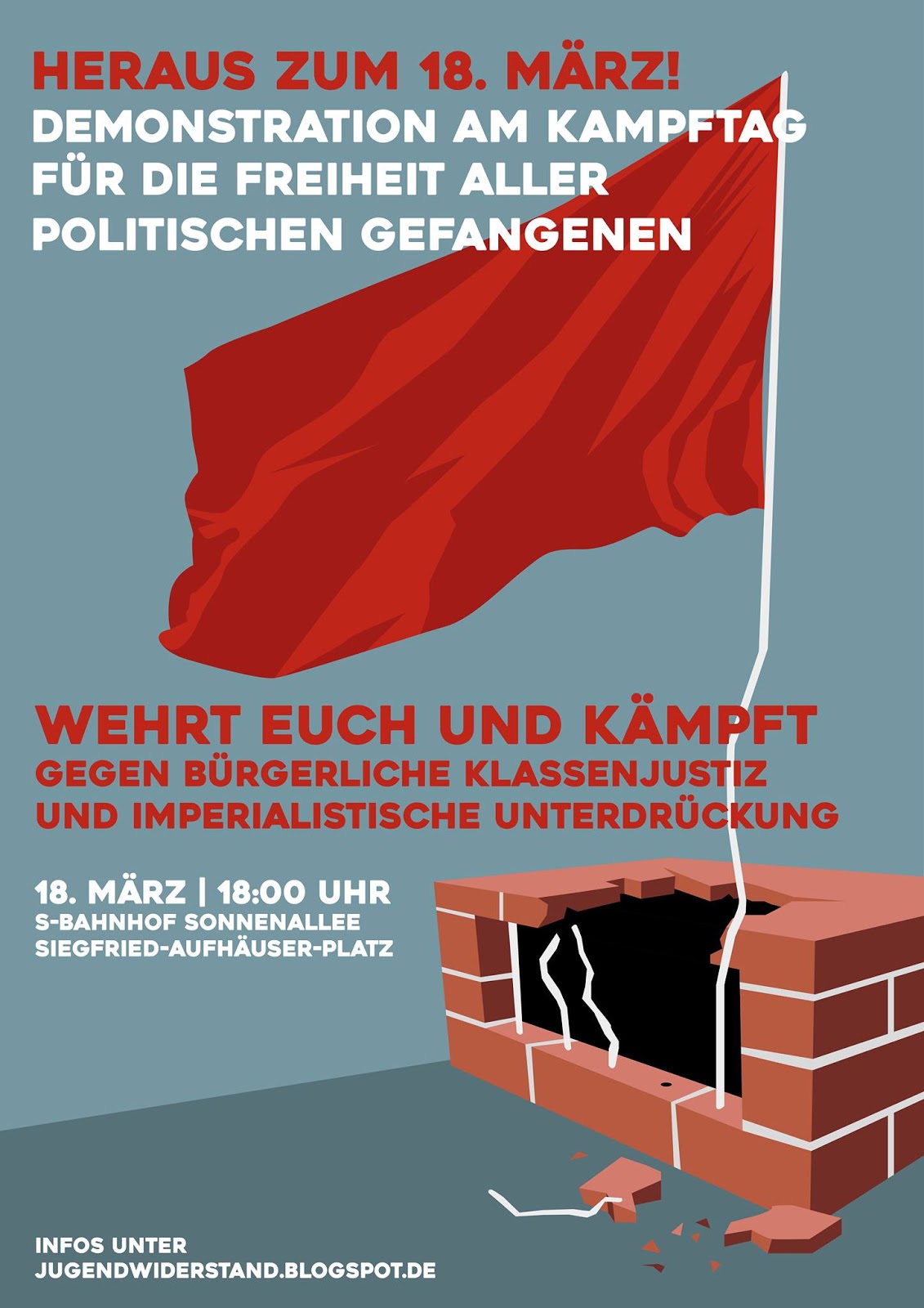 Jugendwiderstand (Youth Resistance), a revolutionary, anti-imperialist youth organization, is organizing a protest to free all political prisoners in Berlin on 18 March. Full call in German and Turkish: http://jugendwiderstand.blogspot.be/2016/03/heraus-zum-18-marz-kampftag-fur-die.html