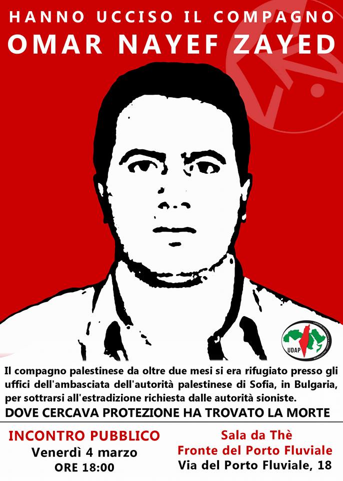 The Arab Palestinian Democratic Union (UDAP) is organizing a public meeting on the case of Omar Nayef Zayed, former Palestinian prisoner killed inside the Palestinian embassy in Sofia, Bulgaria, where he was pursued for extradition by Bulgarian authorities on behalf of the Zionist state.