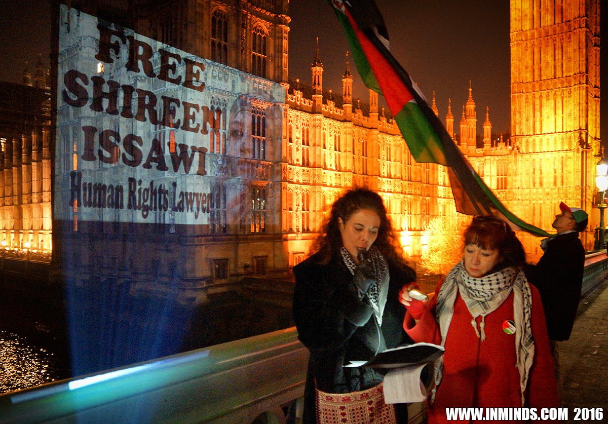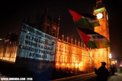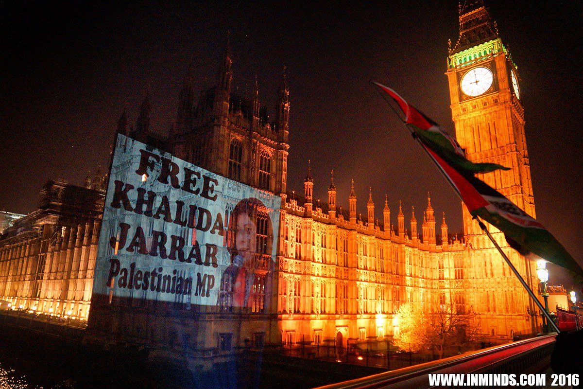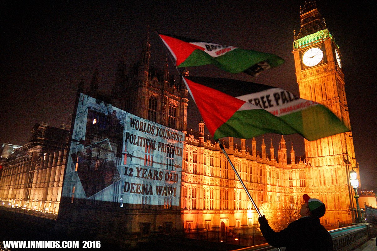 On Friday, 11 March, activists with Inminds protested outside Westminster Palace in London, demanding freedom for Palestinian women prisoners at the seat of the British Government and projecting large images on the building highlighting the cases of imprisoned Palestinian women such as Khalida Jarrar, Lina Jerbouni, and Shireen Issawi and girls like Dima al-Wawi and Marah Bakir. Their report follows: