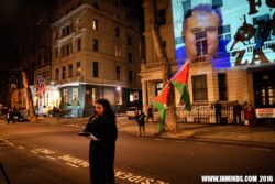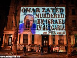 The protest included large projections of Omar Nayef Zayed’s image and demands for justice in his case on the Bulgarian embassy building.