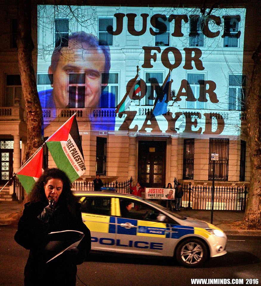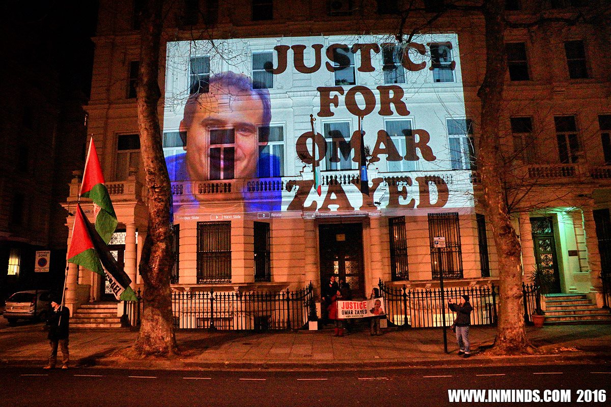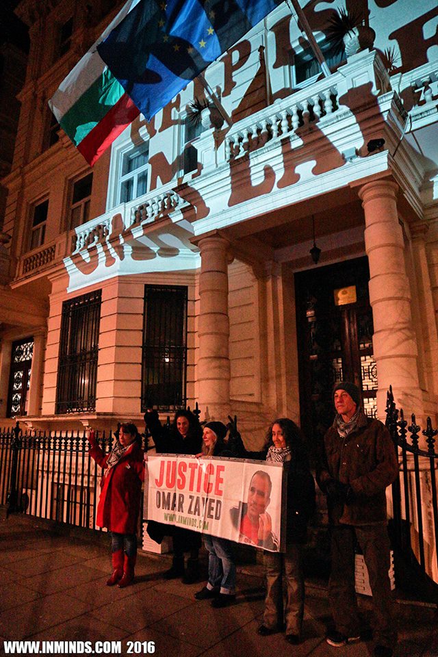 The protest included large projections of Omar Nayef Zayed’s image and demands for justice in his case on the Bulgarian embassy building.