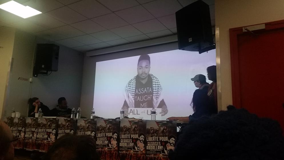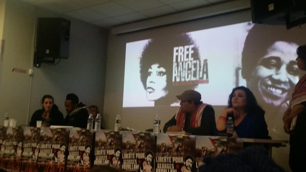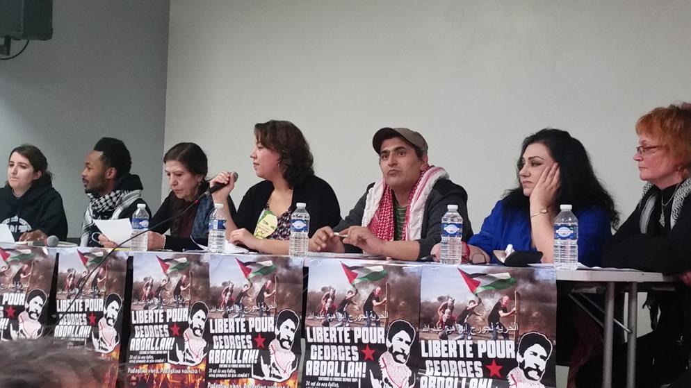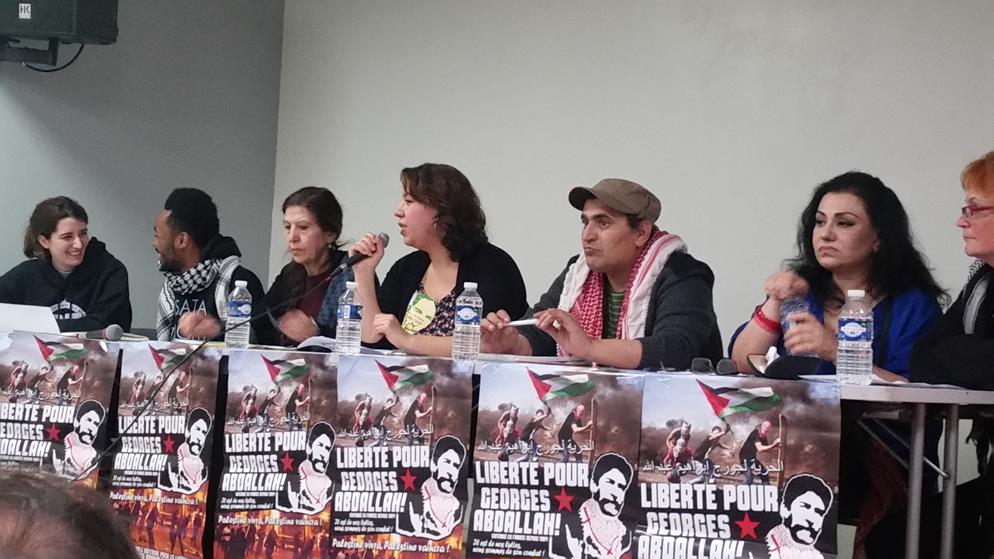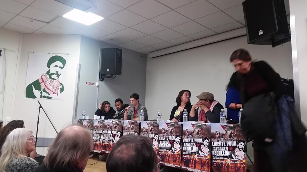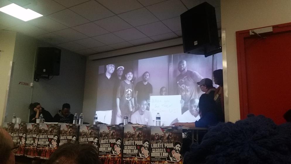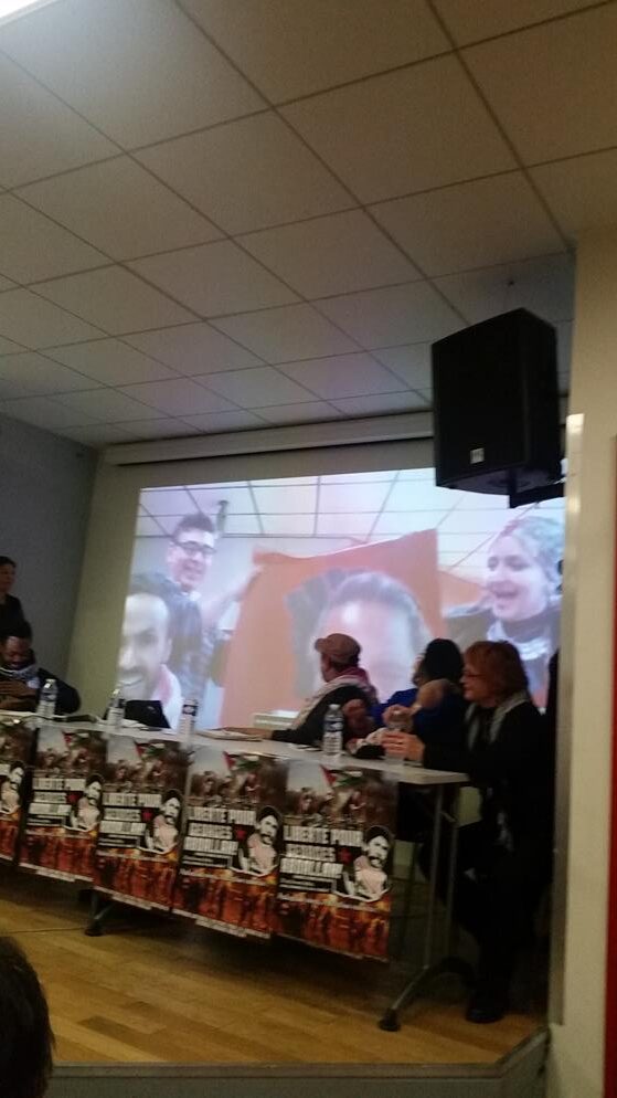 A letter from Georges Ibrahim Abdallah from inside Lannemezan prison was read to the event, which joined parallel events in Bordeaux and Grenoble. A live Skype link with the event in Bordeaux shared greetings between the two mobilizations. “The resurgence of social tensions in the country and the significant ongoing mobilization of youth and unions are leading to the emergence and assertion of an overall atmosphere of struggle, which is conducive to an exchange of ideas and experiences, and thus enriches all of our activity…such an atmosphere of struggle revives our collective memory and the national and international heritage of the struggles of the masses, and the countless revolutionary experiences that are necessary for victory,” wrote Abdallah.