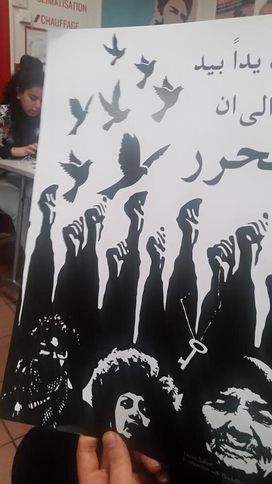 Bailey presented a poster designed by Noura Ballout as a collaboration between Black4Palestine and the z collective, an Arab and Muslim Feminist Collective in Detroit, to Barakat and Mohammed Khatib, Palestinian youth activist and Samidoun organizer. Numerous organizations and parties came together to organize the event, which was also part of Anti-Colonialism Week and Israeli Apartheid Week in Paris and its surrounding areas.