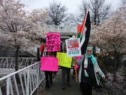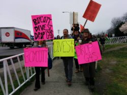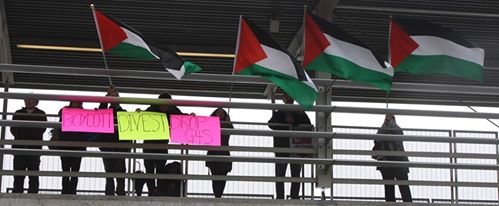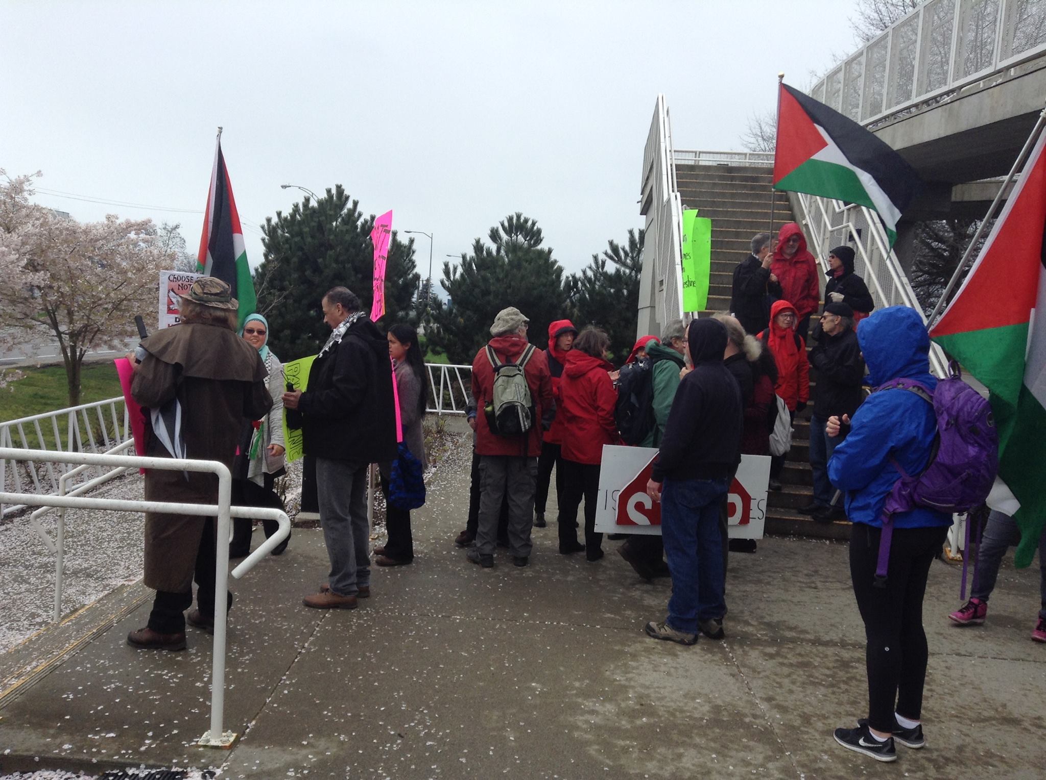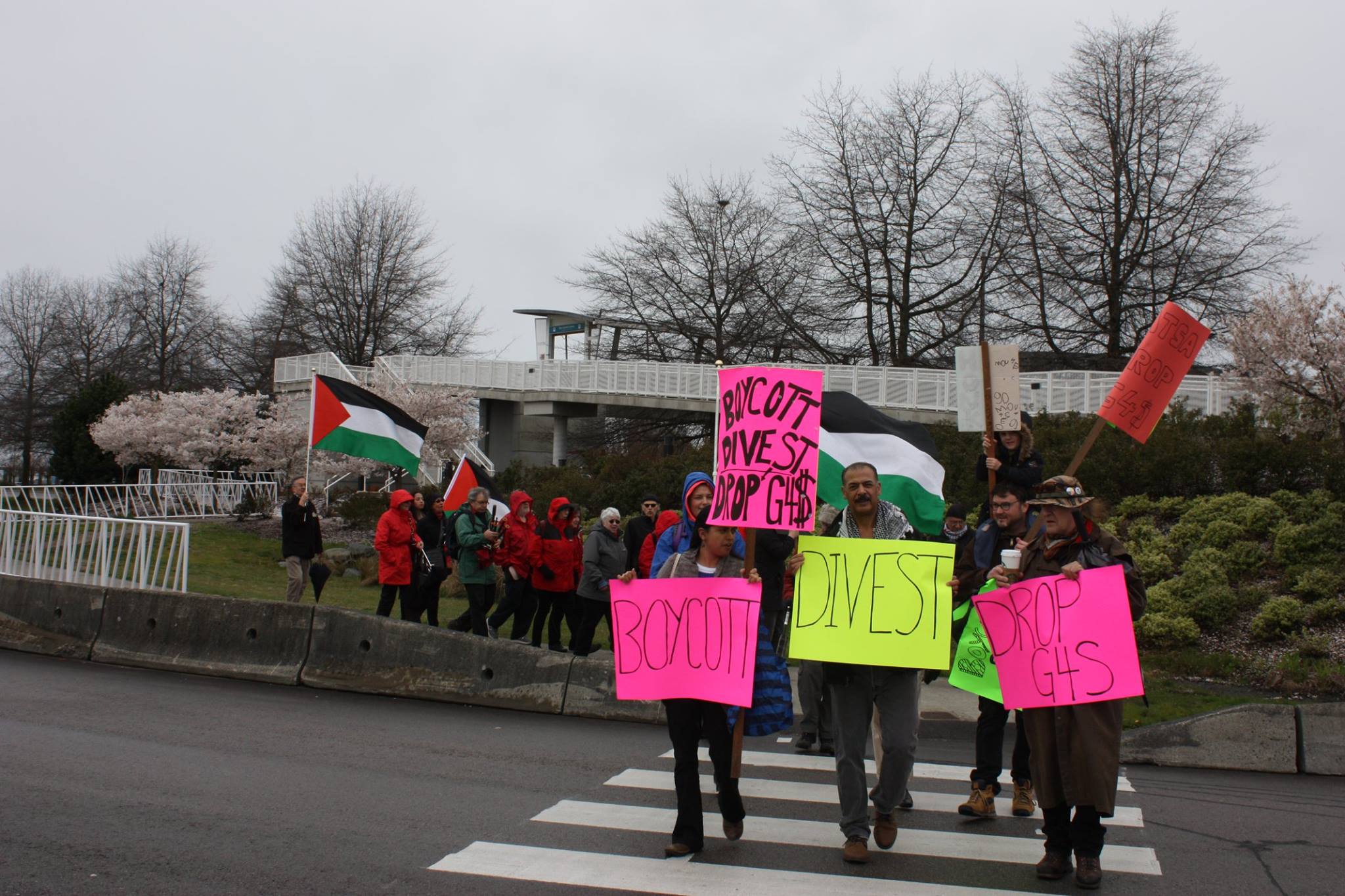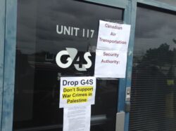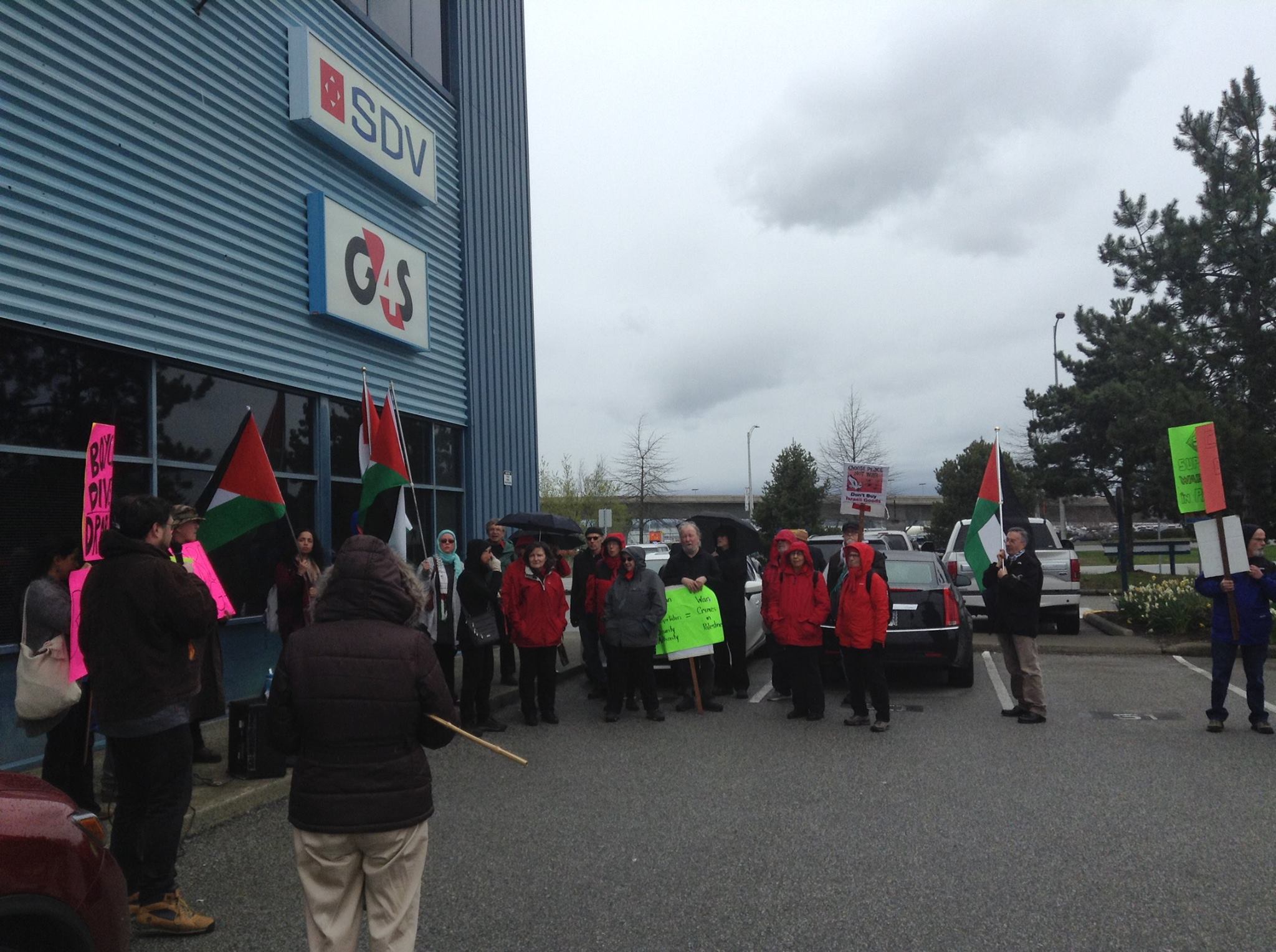 With chants of “G4S: You can’t hide! You support apartheid!” and “Boycott, Divest, Drop G4S” a group of Palestine solidarity activists in Vancouver announced their campaign calling for the Canadian Air Transportation Security Authority (CATSA) to drop its contract with British security company and occupation profiteer G4S. The activists converged on the Aviation Office of G4S Canada near the Vancouver International Airport, accompanied by songs of struggle from Solidarity Notes Choir, where they held a short program. Aiyanas Ormond said that “the G4S business model is fundamentally about protecting the interests of the rich and the powerful against the poor and oppressed, in Palestine and around the world” and Khalil Mansour highlighted that these actions of solidarity “give hope to the ones back home, and help them sustain their resistance to occupation”. Spokespeople then attempted to deliver a letter to the office, but were met with a locked door and silence. The statement was therefor attached to the door.
