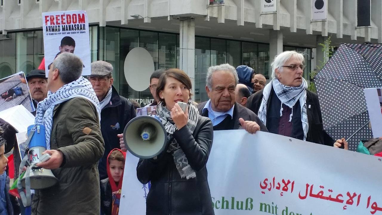 Claire Geraets, a deputy of the Workers Party of Belgium in the Brussels-Capital Region Parliament and a physician with Medicine for the People in Schaerbeek, spoke at the event, expressing solidarity with the Palestinian people and Palestinian prisoners.
