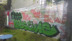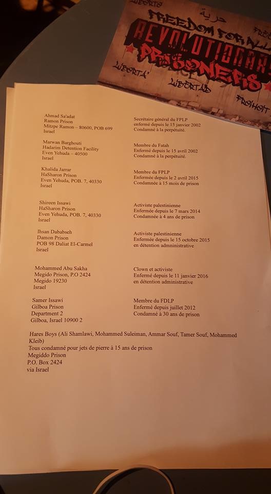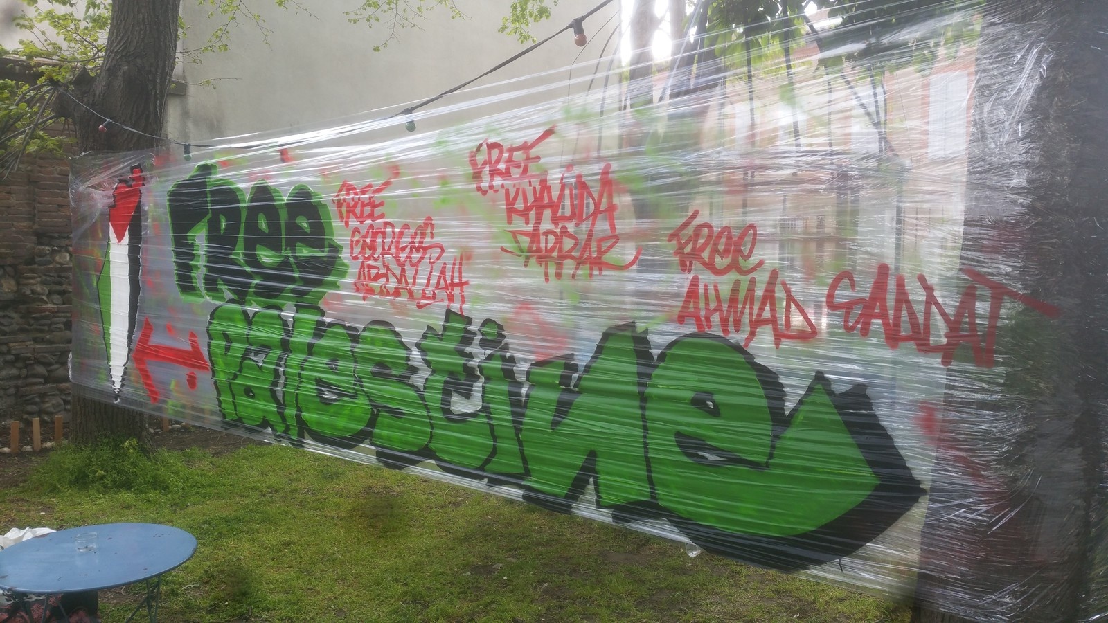 The event featured a massive graffiti-art banner with the slogan, “Free Palestine” and calls to free Abdallah, Sa’adat and Jarrar. Participants also focused on the struggles and lives of Palestinian refugees in Lebanon, denied their right to return to Palestine generation after generation for over 68 years. A film was screened on Palestinian refugees in Lebanon and nearly 1200 EUR were raised to support the Palestinian Youth Center in Ain el-Helweh Camp in Lebanon.