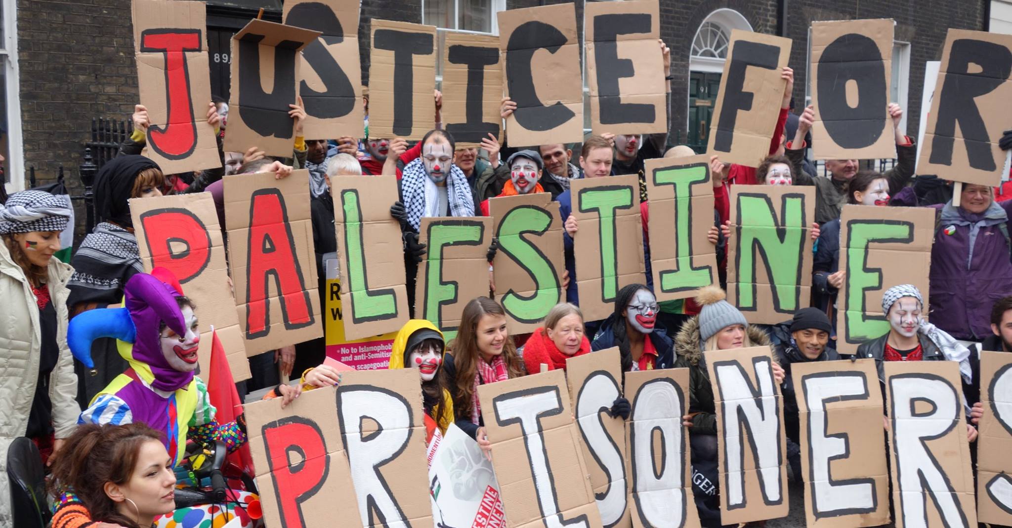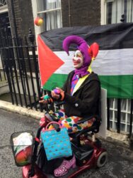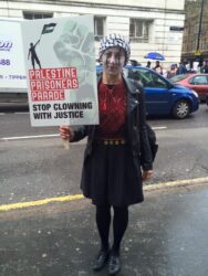 Coming together around the case of imprisoned 24-year-old circus teacher and performer Mohammed Abu Sakha, held in administrative detention without charge or trial, the participants called for justice and freedom for all 7,000 Palestinian prisoners in Israeli jails. Participants wore clown makeup and circus gear both to highlight Abu Sakha’s case and to draw attention to their creative protest and calls for freedom.