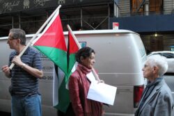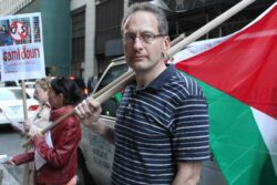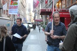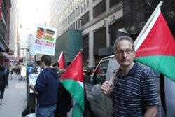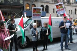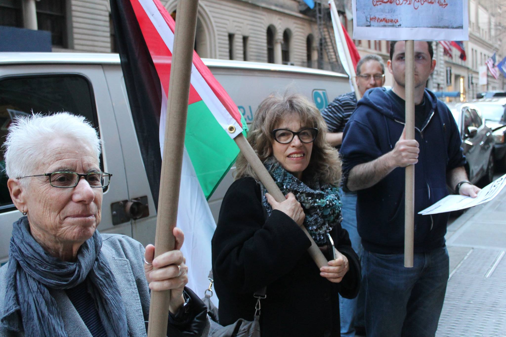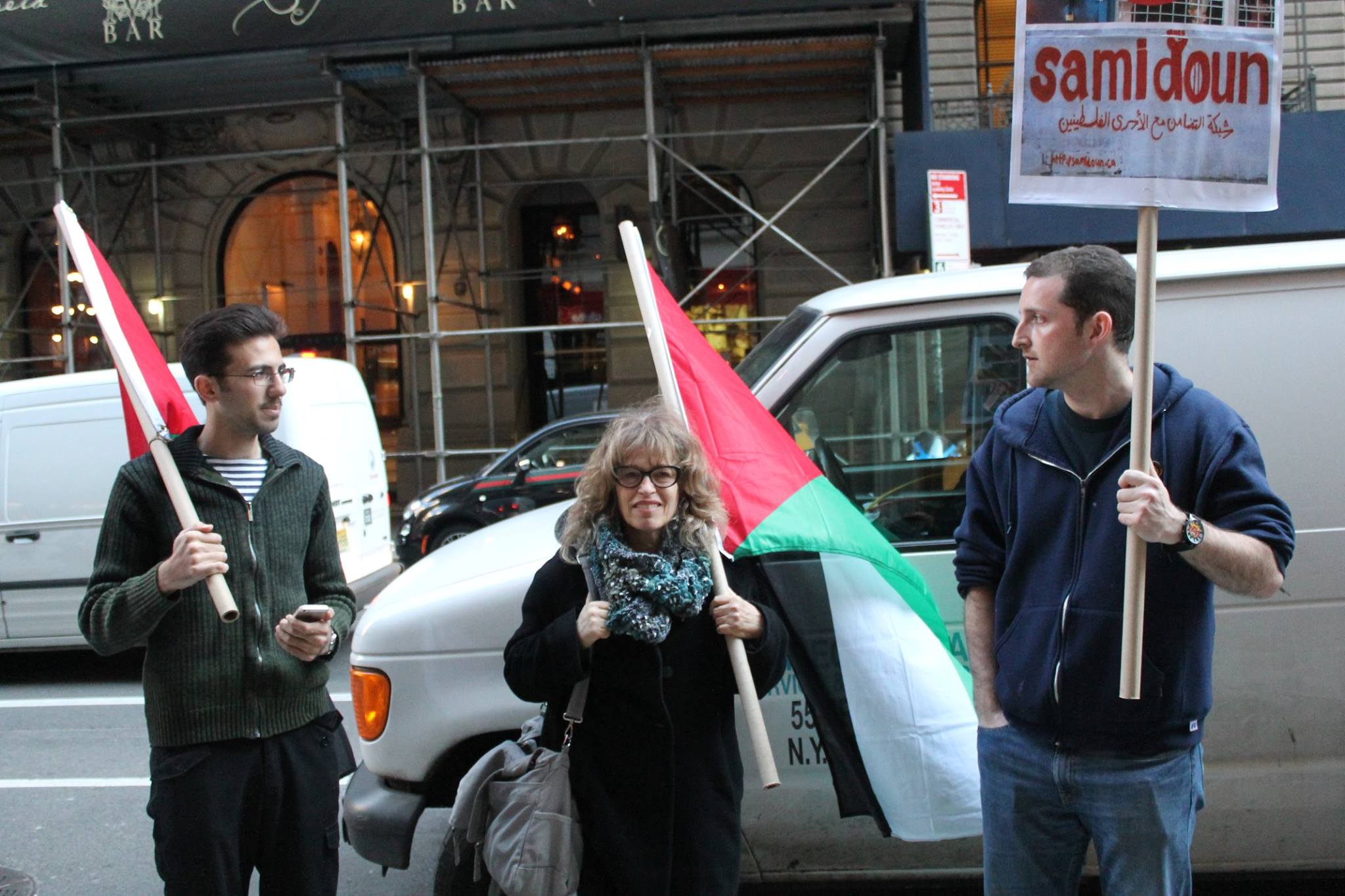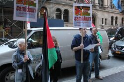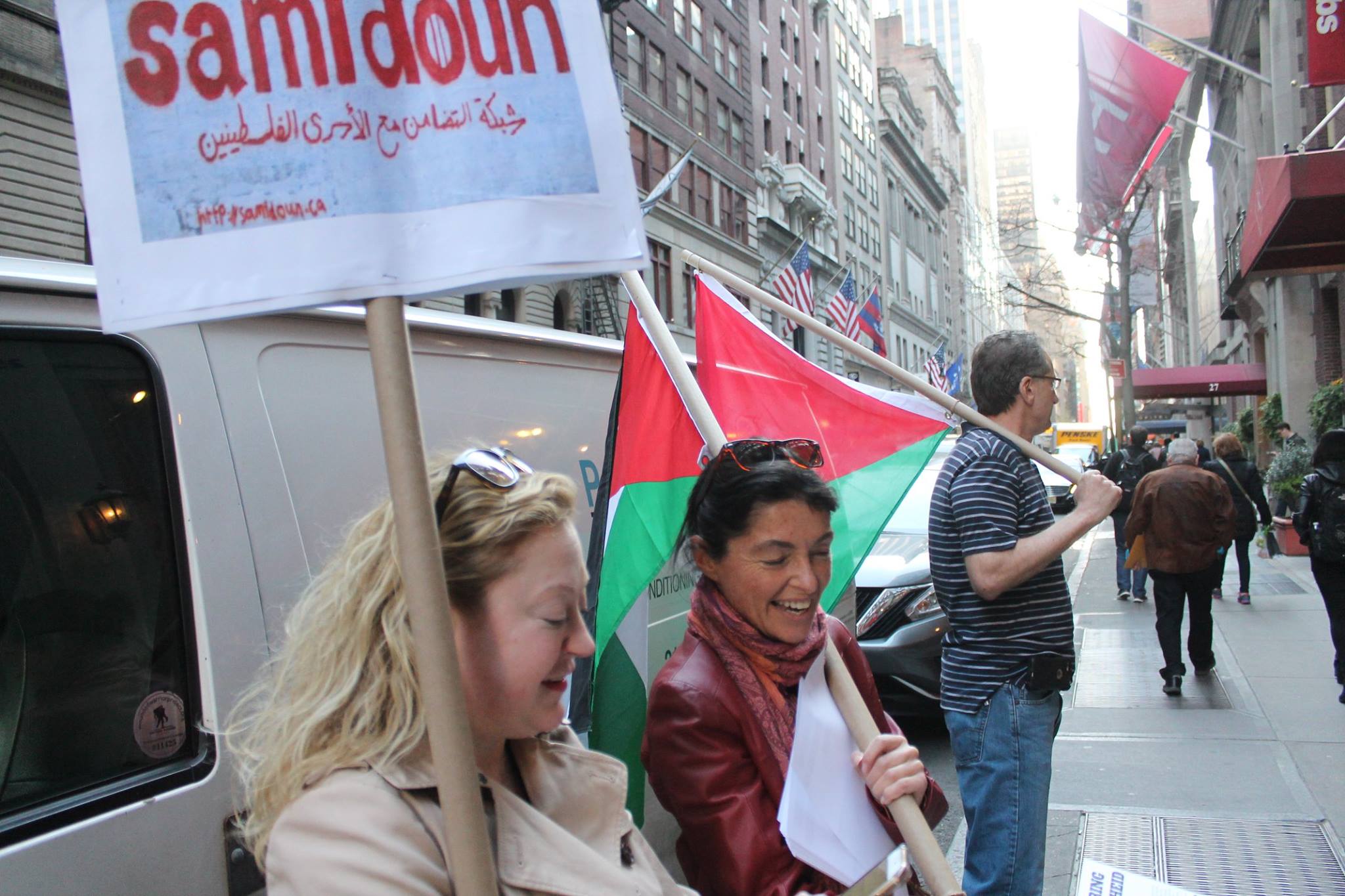 Samidoun protests weekly in New York City outside G4S offices at 19 W. 44th Street in Manhattan, on Fridays at 4:00 pm. This week, the protest comes in preparation for a bigger action on Sunday, 17 April, marking Palestinian Prisoners’ Day. Participants at the demonstration included Laura Whitehorn, former U.S. political prisoner and lifelong anti-imperialist activist, asserting solidarity with Palestinian prisoners in Israeli jails.