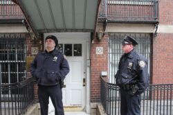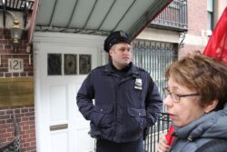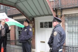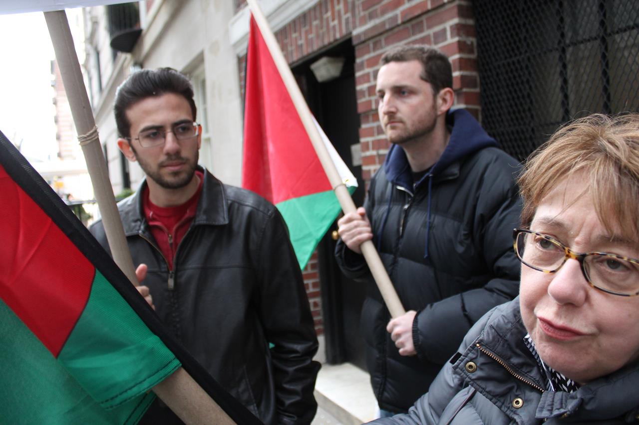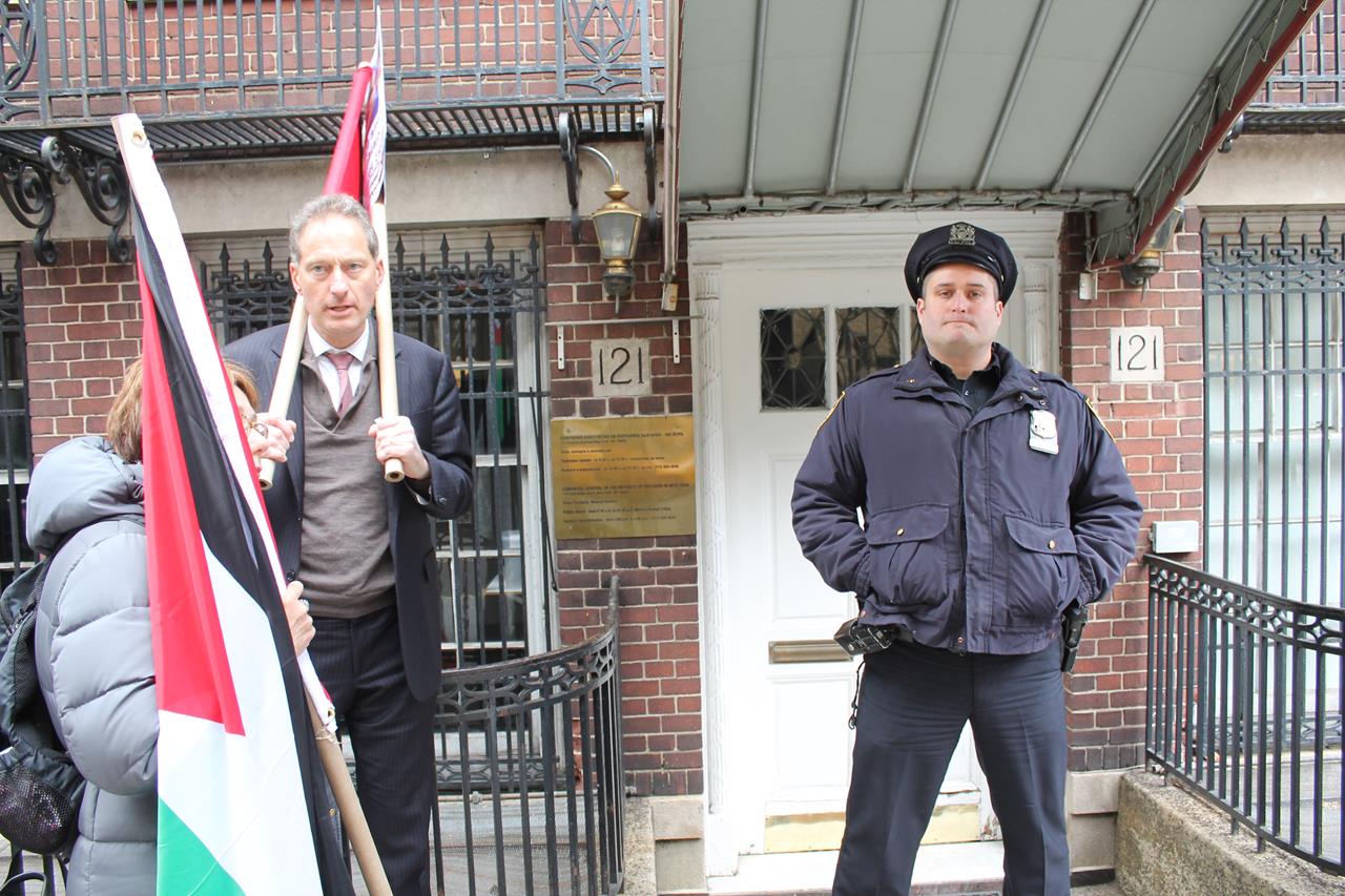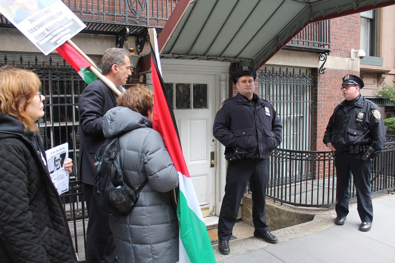 When arriving at the Palestinian mission, the demonstrators were met by a police car filled with NYPD “counter-terrorism” officers; the NYPD had seemingly been alerted to the demonstration by the mission. In addition, a representative of the U.S. State Department was present outside the mission, who identified himself as a State Department liaison to mediate between demonstrators, the mission and the police.