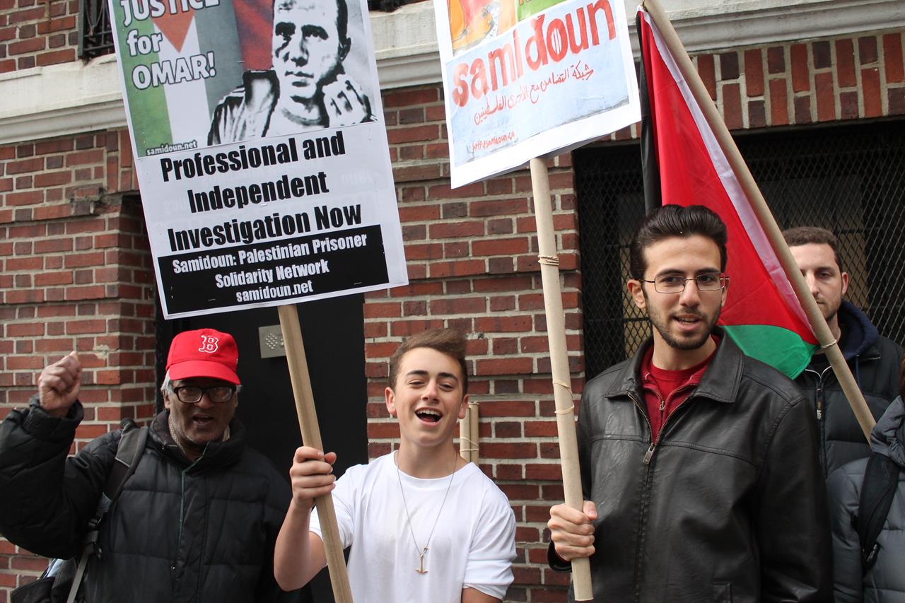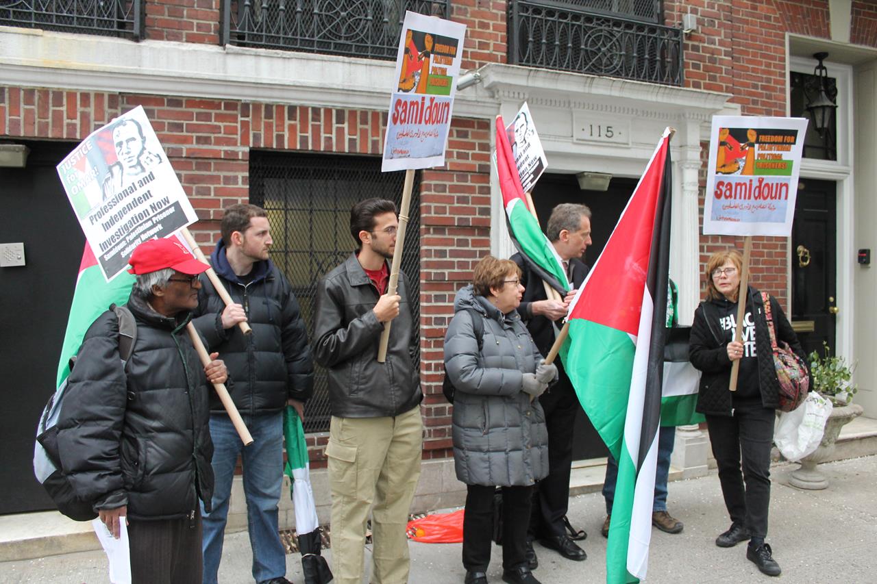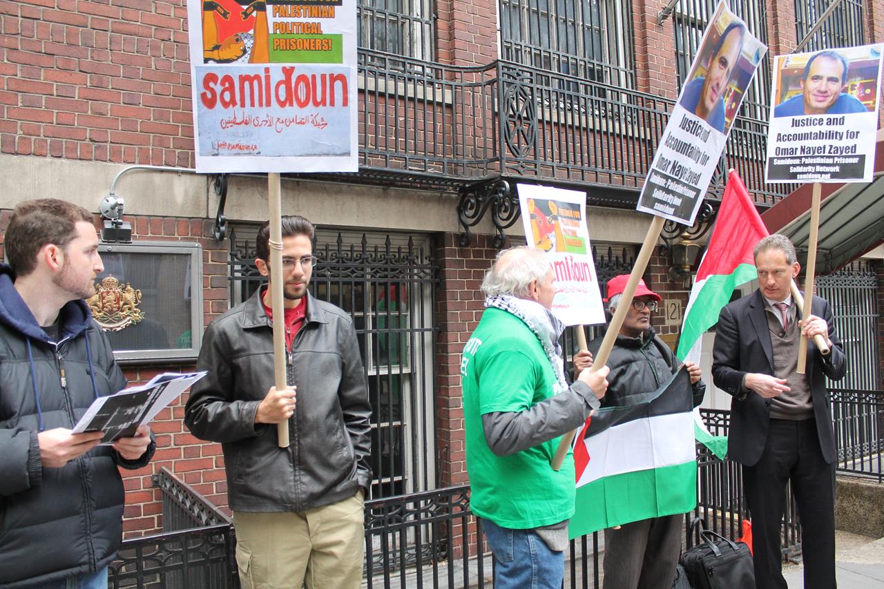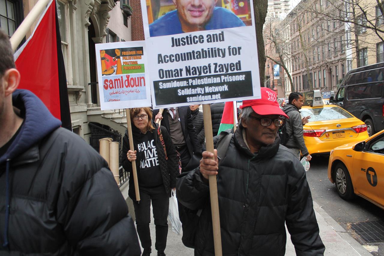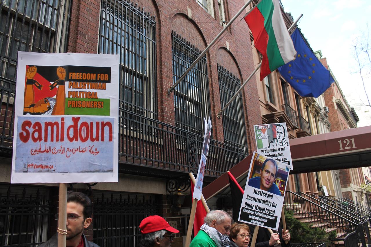 Demonstrators in New York City called for justice for Omar Nayef Zayed on Friday, 8 April, as part of an international call for action for justice in the case of the former Palestinian prisoner who was found dead in the Palestinian embassy in Sofia, Bulgaria on 26 February.