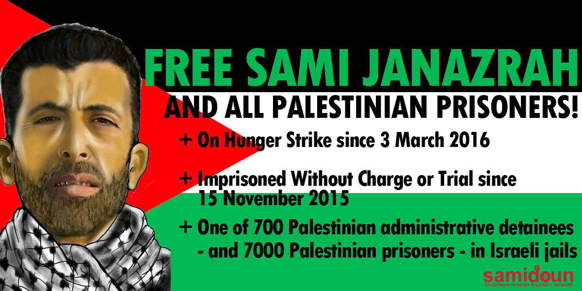 Palestinian prisoner Sami Janazrah has now been on hunger strike for 52 days to demand his freedom from Israeli jails, where he is held under administrative detention without charge or trial. On Thursday, 21 April – his 50th day of hunger strike – he lost consciousness and suffered a head injury as he was transferred from isolation in the Naqab desert prison to isolation in Ela prison.