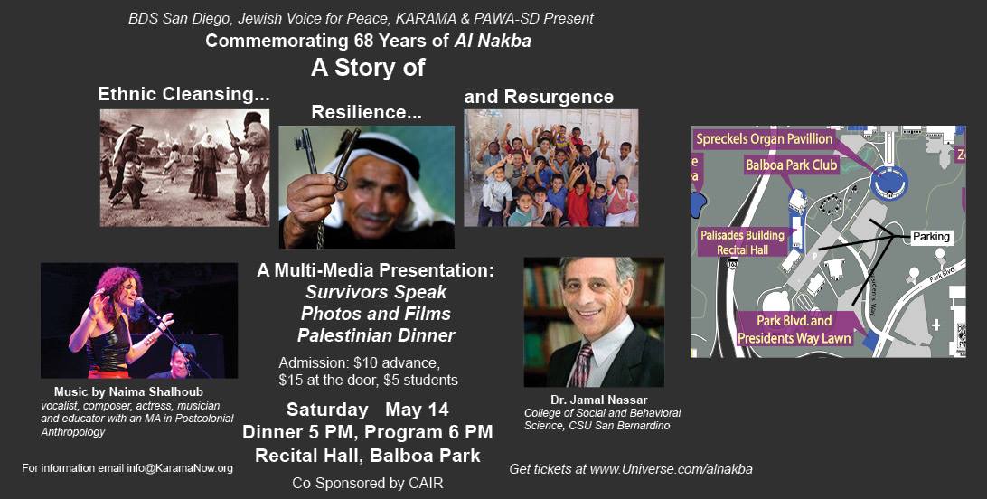 Sunday, 15 May – Forum on the Nakba, 1948-2016. Facebook: https://www.facebook.com/events/1107523392631820/