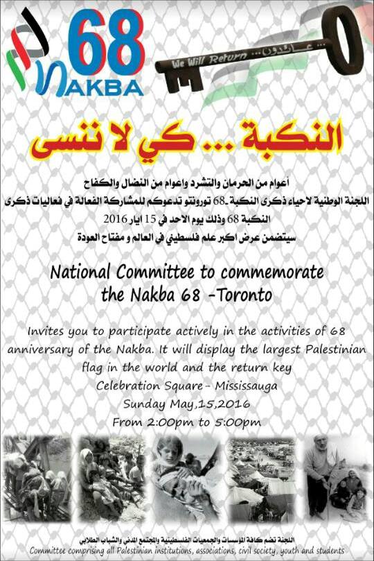 Friday, 13 May – Nakba Commemoration. More info: http://www.thejerusalemfund.org/events/upcoming/nakba-commemoration-day-may-13-2016